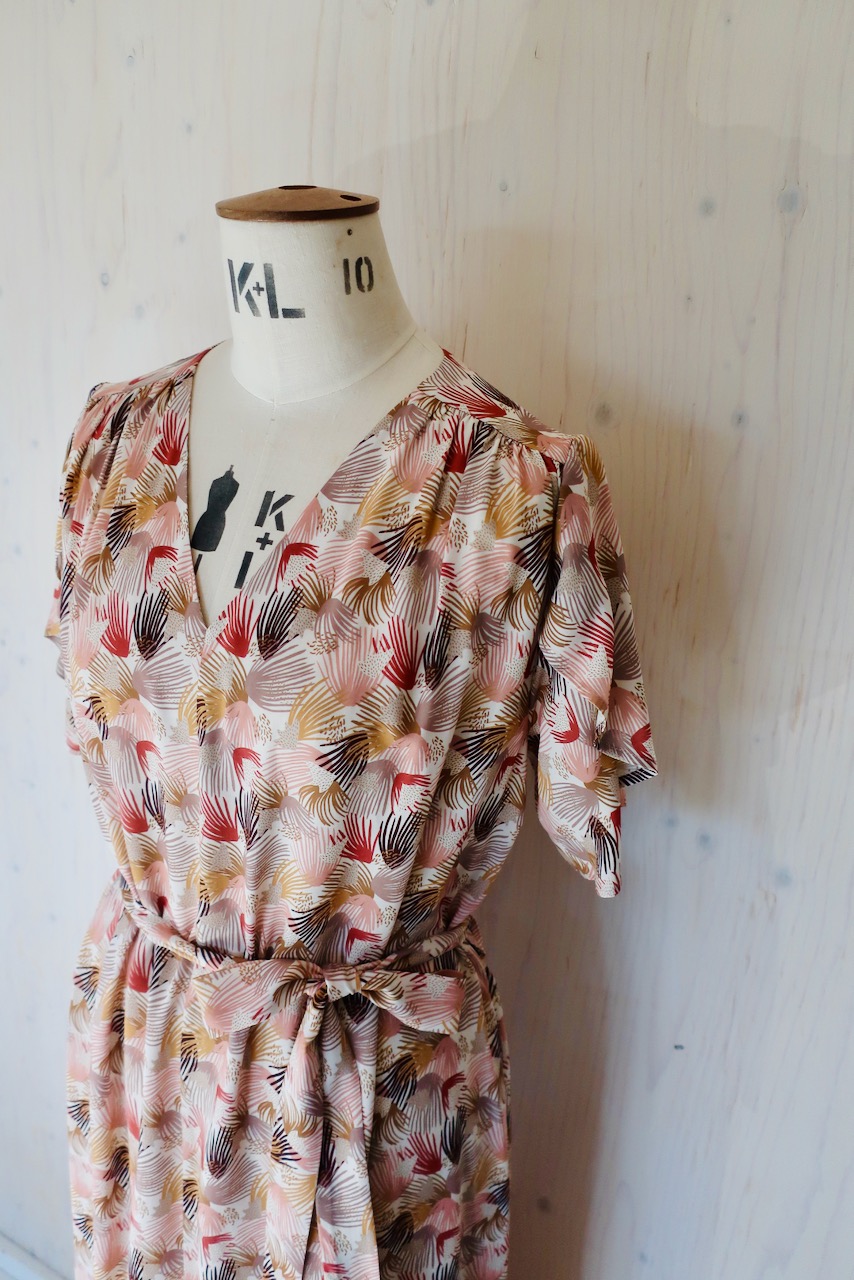 MOLUCCELLA is a gorgeous a-lined dress with beautiful ruffles on the front shoulder and upper back. The dress has short tulip sleeves and a fabric belt. The front has a v-neckline and pockets in the side seams. Dress is made from surplus fabric, which is 100% viscose. The dress is sewn in Estonia. Indicative dimension table in the pictures. We recommend washing with a 30 degree fine wash inside out or by hand (shrinkage margin 5%). No soaking