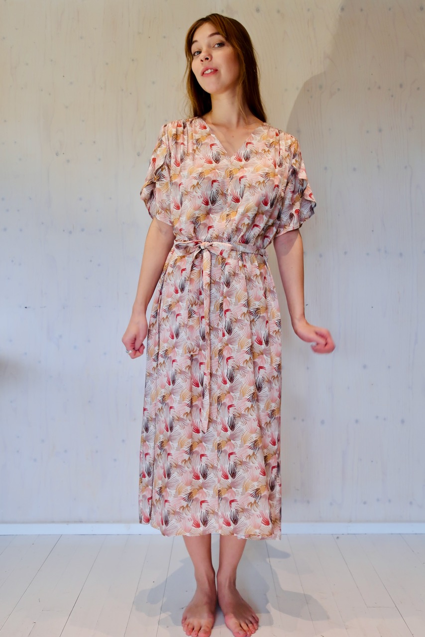 MOLUCCELLA on upea a-linjainen mekko, jossa on kauniit rypytykset etuolalla ja yläselässä. Mekossa on lyhyet tulppaanihihat ja kankainen vyö. Edessä on v-pääntie sekä taskut sivusaumoissa. Mekko on valmistettu ylijäämäkankaasta, joka on 100% viskoosia. Mekko on ommeltu Virossa. Suuntaa antava mittataulukko kuvissa. Suosittelemme pesemään 30 asteen hienopesulla nurinpäin tai käsin (kutistumisvara 5%). Ei liotusta. Silitys nurjalta puolelta yhdellä pisteellä. Mekkoa löytyy koissa S, M ja L. Ilmoita tilauksen yhteydessä toivomasi koko.