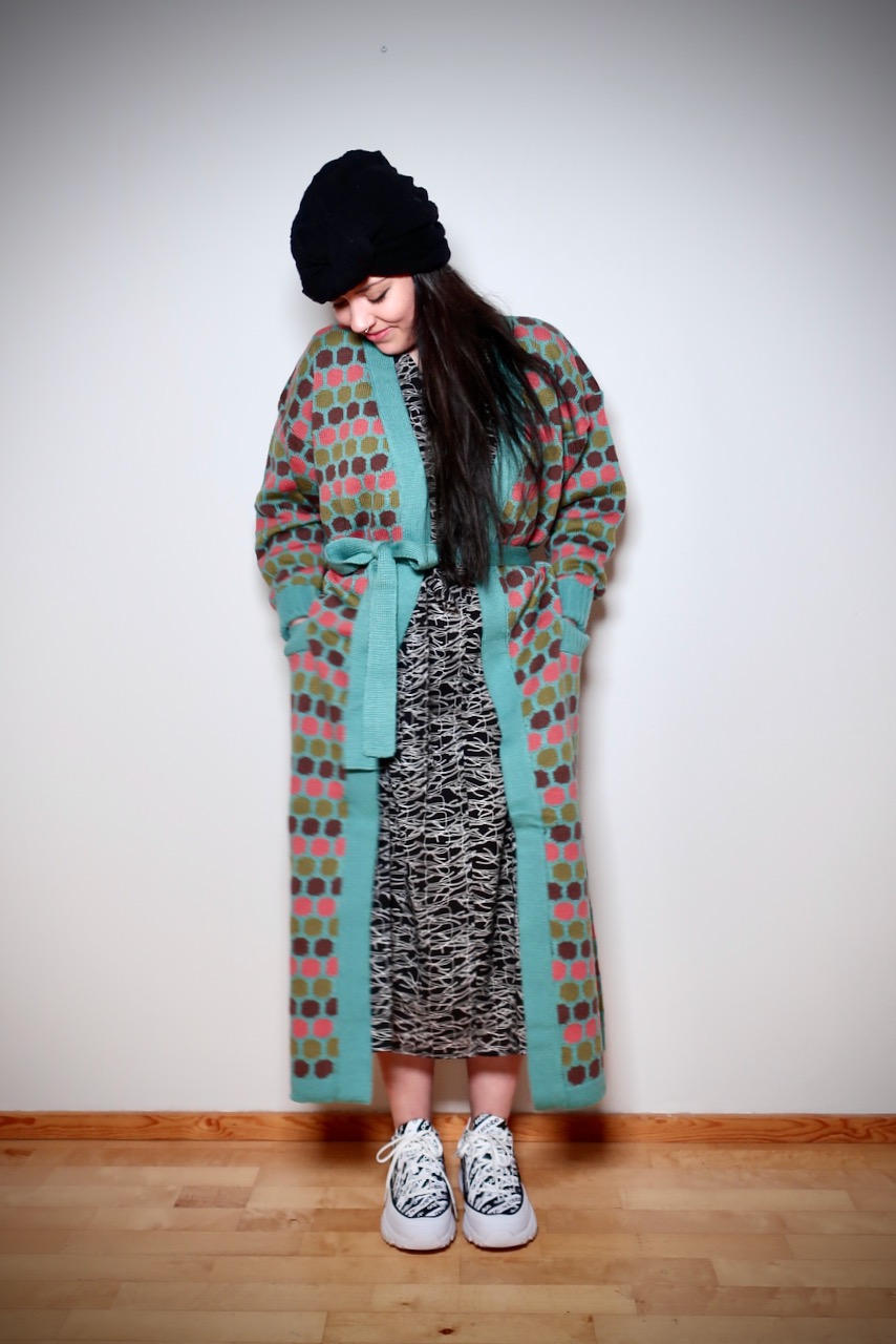 Mamaha’s GODETIA patterned cardigan is made of warm and soft merino wool. The jacket is straight and has a v-neckline and pockets on both sides at the front. The jacket can be fastened with a knitted belt. In the fall and spring, Godetia can be used as a jacket.