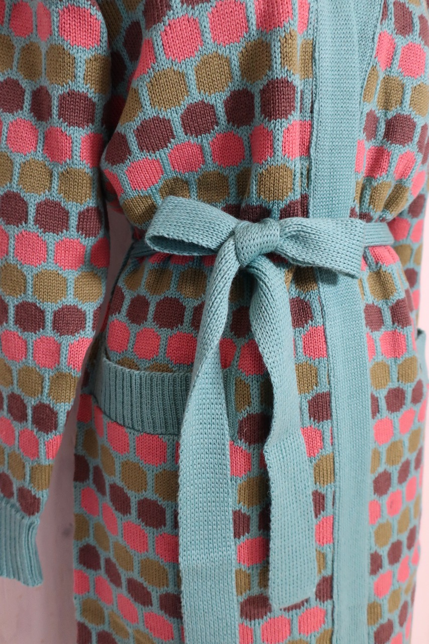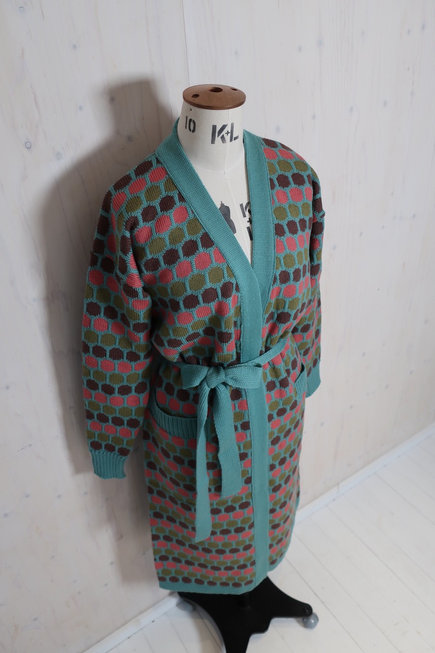 GODETIA kuvio-neuletakki on lämmittävää ja pehmeää merinovillaa. Takki on suoralinjainen ja siinä on v-pääntie ja edessä molemmin puolin taskut. Takin saa kiinni neulosvyöllä. Syksyllä ja keväällä Godetia käy hyvin myös takkina. Neuletakki on valmistettu ylijäämä langasta, joka on 100% merinovillaa. Valmistusmaa Viro. Neuletakki saatavilla koossa S ja M. Ilmoita kumman koot haluat tilauksen yheydessä. Energian säästämiseksi suosittelemme villatuotteille ensisijaisesti tuuletusta, mutta materiaali kestää myös 30 asteen käsinpesun. Tuote täytyy kuivata tasossa. Tuotetta ei saa liottaa eikä rumpukuivata.