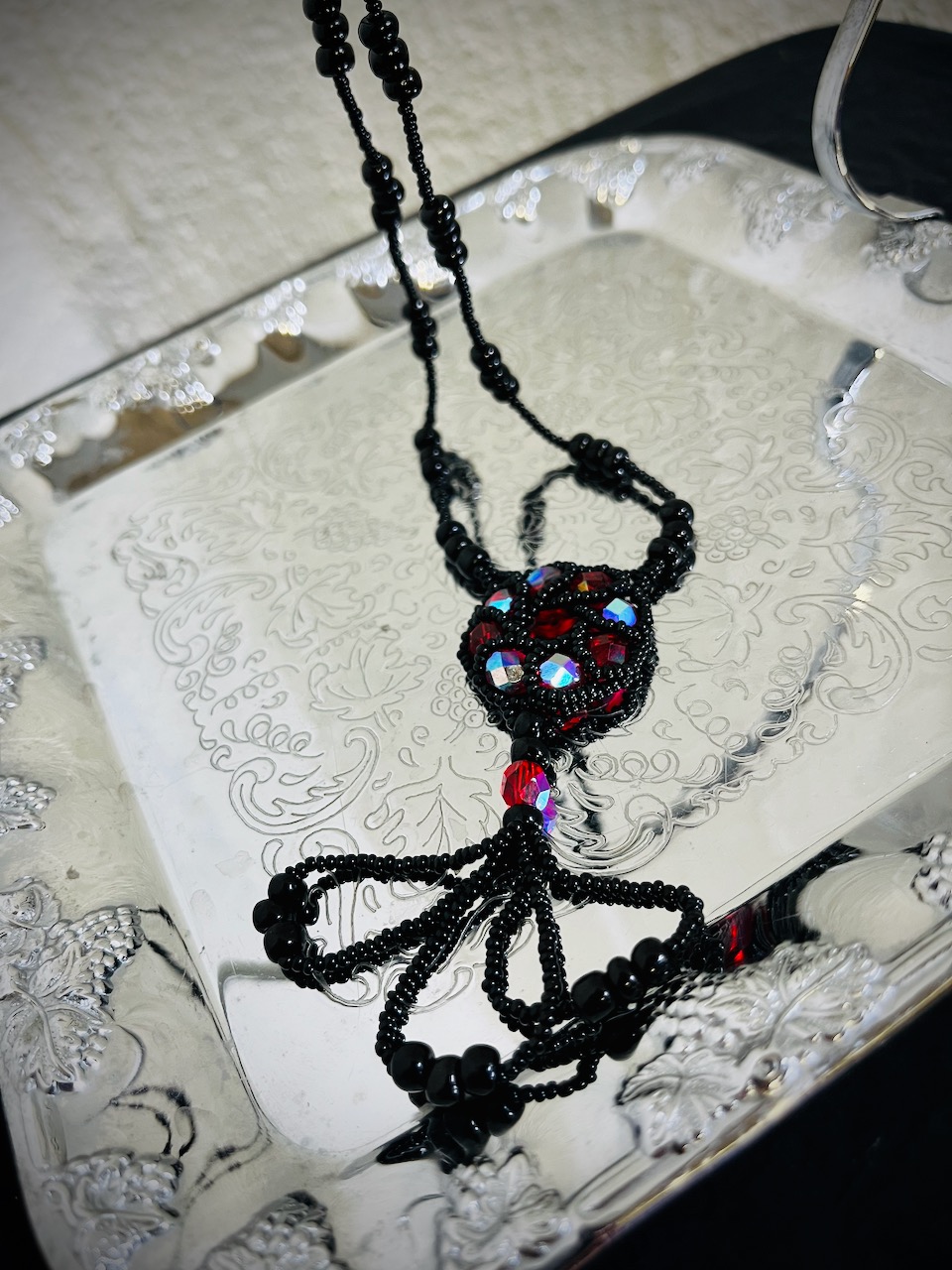 Tämä pitkä vintage-riipus on käsinpunottu mustista pienistä helmistä ja isommasta punaisesta lasihelmestä.