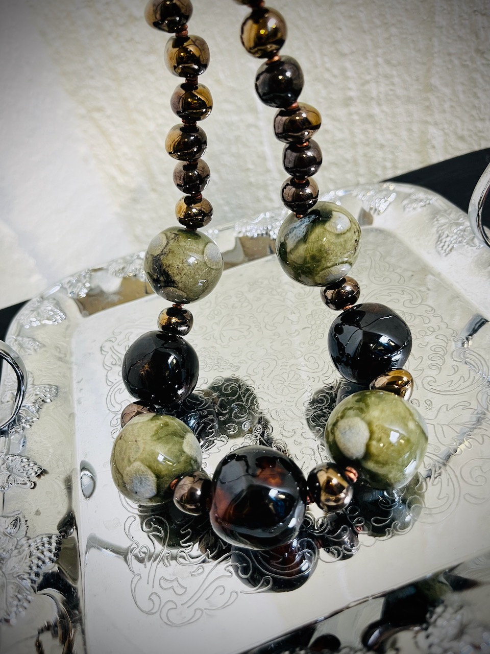 Nämä kauniit vintage-helmet on valmistettu erikokoisista posliini helmista. Värity metallinhohtoinen ruskea ja vihreä.