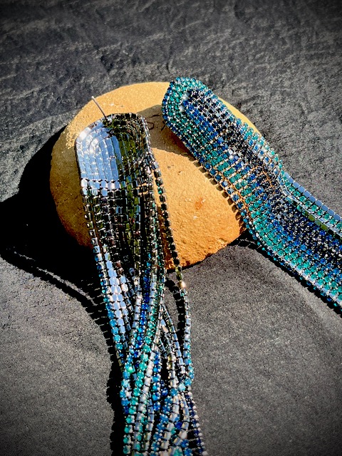 Nämä näyttävät pre-loved strassikorvakorut ovat pitkät ja näyttävät. Väritys vihreän, sinisen jamusta yhdistelmä.