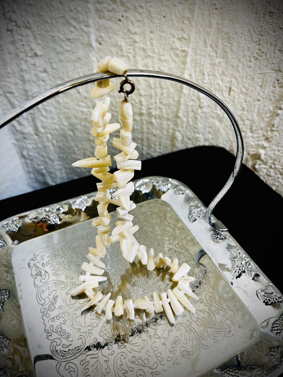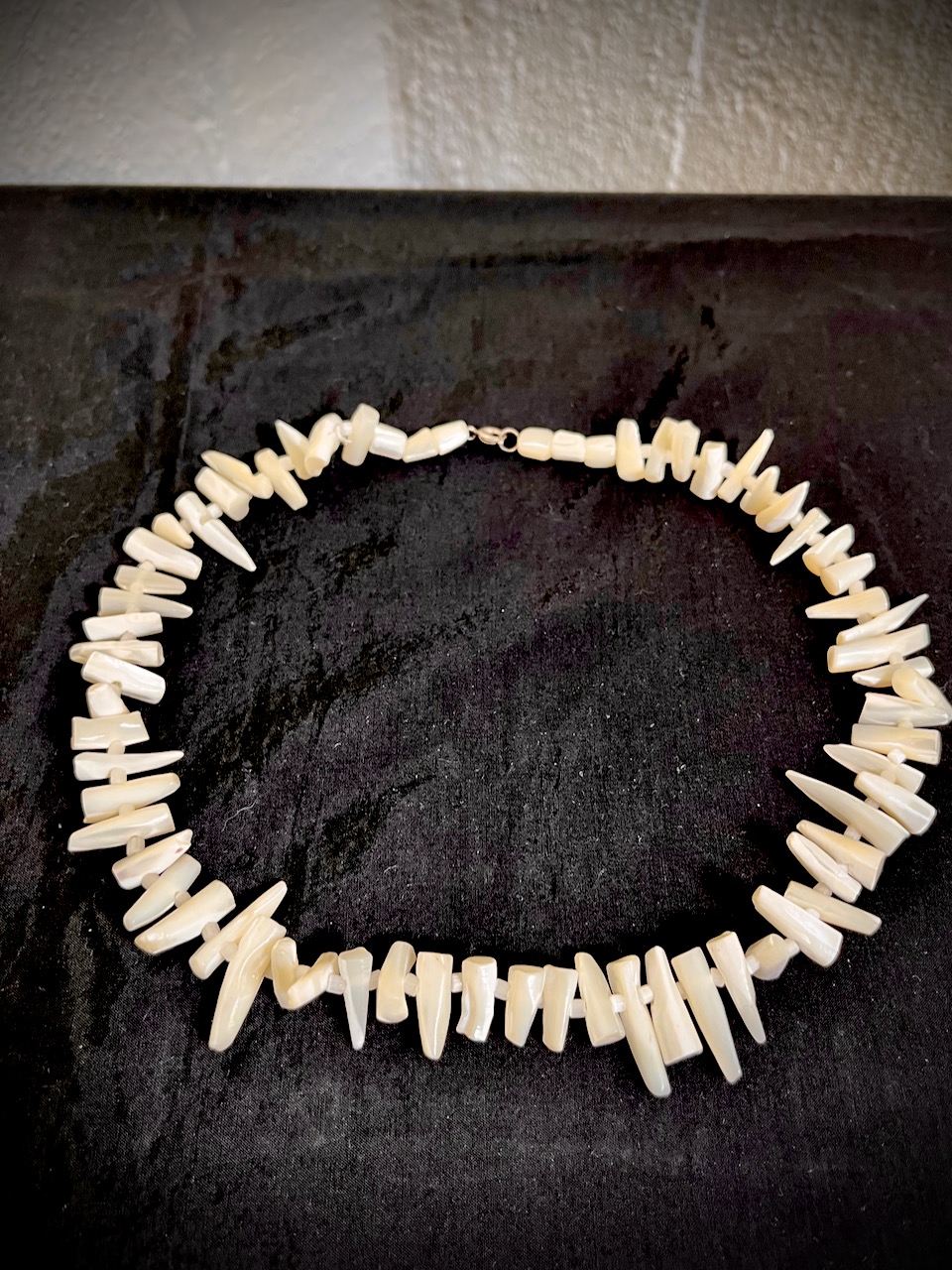 Tämä lyhyt vintage-kaulakoru on valmistettu luonnonvalkoista helmiäispalasista.