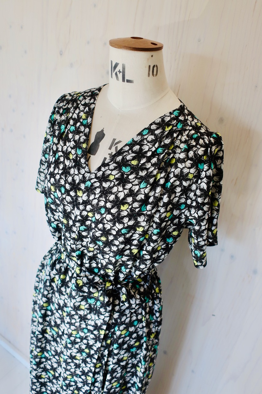 MOLUCCELLA is a gorgeous a-lined dress with beautiful ruffles on the front shoulder and upper back. The dress has short tulip sleeves and a fabric belt. The front has a v-neckline and pockets in the side seams. Dress is made from surplus fabric, which is 100% viscose. The dress is sewn in Estonia. Indicative dimension table in the pictures. We recommend washing with a 30 degree fine wash inside out or by hand (shrinkage margin 5%). No soaking