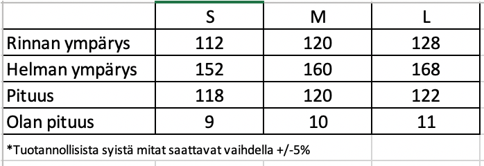 MOLUCCELLA on upea a-linjainen mekko, jossa on kauniit rypytykset etuolalla ja yläselässä. Mekossa on lyhyet tulppaanihihat ja kankainen vyö. Edessä on v-pääntie sekä taskut sivusaumoissa. Mekko on valmistettu ylijäämäkankaasta, joka on 100% viskoosia. Mekko on ommeltu Virossa. Suuntaa antava mittataulukko kuvissa. Suosittelemme pesemään 30 asteen hienopesulla nurinpäin tai käsin (kutistumisvara 5%). Ei liotusta. Silitys nurjalta puolelta yhdellä pisteellä. Mekkoa löytyy koissa S, M ja L. Ilmoita tilauksen yhteydessä toivomasi koko.