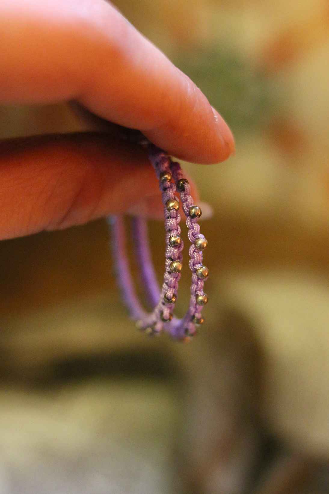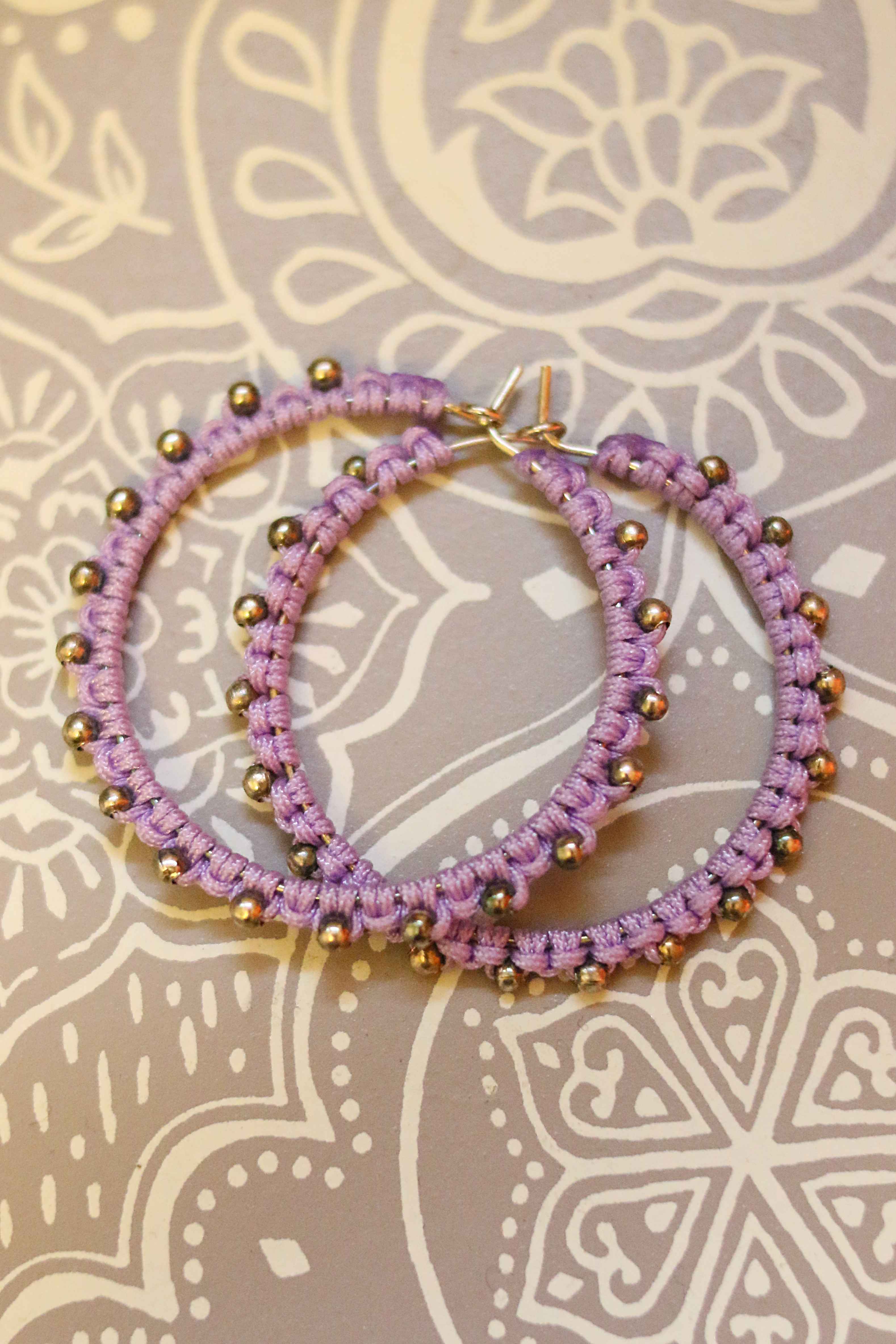 Akryylihelmiä sisältävät korut nyt poistohinnalla! Makramee tekniikalla valmistetut korvakorut lilan värisellä langalla ja hopeisilla korunosilla. Materiaalina nylon nyöri, ruostumaton teräs sekä akryylihelmet. Renkaan halkaisija 35 mm.