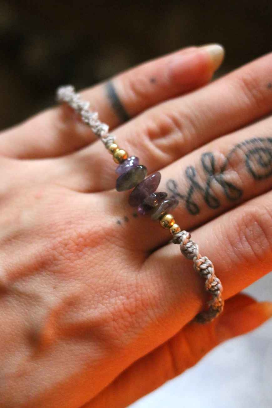 Käsin solmittu vaalean beige makramee-rannekoru, jota koristavat kauniit ametistisirut ja pienet kullanhohtoiset messinkihelmet. Ametisti tunnetaan rauhoittavana ja henkistä selkeyttä vahvistavana kivenä – se tuo mukanaan lempeää tasapainoa ja sisäistä harmoniaa. HUOM! Voit valita tuotteelle joko noudon kivijalkaliikkeestä (Kirkkokatu 2, Vihreä Huone, Oulu) tai postituksen kotimaahan. Jos valitset postituksen, lisää ostoskoriin Toimitukset kategoriasta "pieni toimitus kotimaa XXS". Ostat siis 2 tuotetta: sekä korun että postituksen sille. Jos sinulle tulee kysyttävää, voit laittaa viestiä instagramissa @bypetrakatariina tai sähköpostia: bypetrakatariina@gmail.com