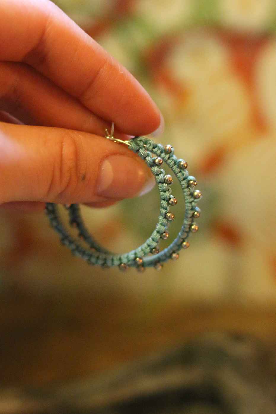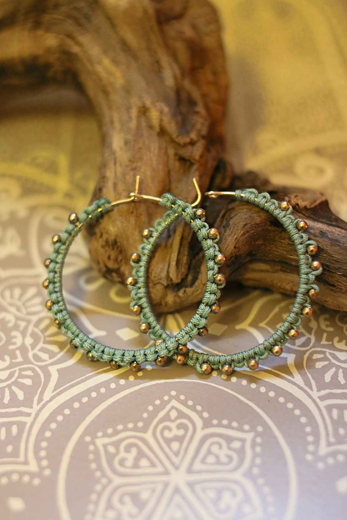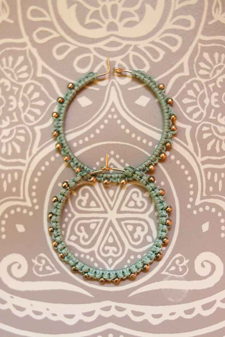 Akryylihelmiä sisältävät korut nyt poistohinnalla! Makramee tekniikalla valmistetut korvakorut vaalean vihreällä langalla ja hopeisilla korunosilla. Materiaalina nylon nyöri, ruostumaton teräs sekä akryylihelmet. Renkaan halkaisija 35 mm.