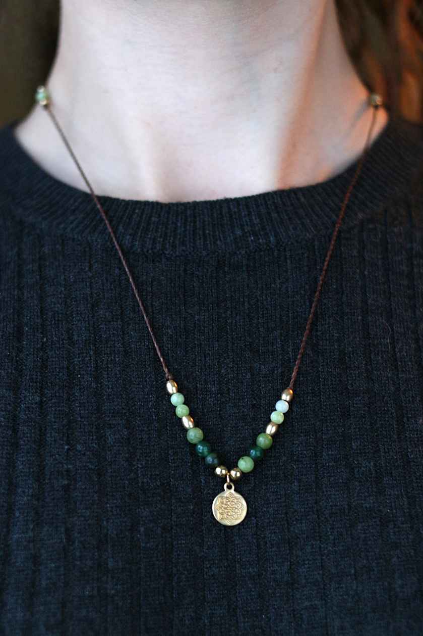 Käsin koottu kaulakoru, jossa yhdistyy kahden eri kiven vihreä mystinen väri sekä kaunis messinkikulta. Kaulakorussa on säädettävä ympärysmitta. Materiaalina: vahattu puuvillanaru, messinkiset korunosat sekä vihreä aventuriini ja jade. HUOM! Voit valita tuotteelle joko noudon kivijalkaliikkeestä (Kirkkokatu 2, Vihreä Huone, Oulu) tai postituksen kotimaahan. Jos valitset postituksen, lisää ostoskoriin Toimitukset kategoriasta "pieni toimitus kotimaa XXS". Ostat siis 2 tuotetta: sekä korun että postituksen sille. Jos sinulle tulee kysyttävää, voit laittaa viestiä instagramissa @bypetrakatariina tai sähköpostia: bypetrakatariina@gmail.com