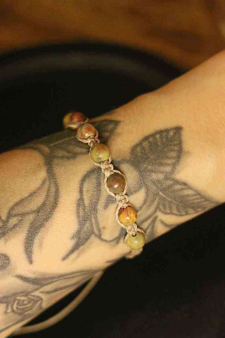Klassisesti muotoiltu kivikoru makrameetekniikalla toteutettuna. Materiaalina vahattu polyesterinyöri ja unakiitti. Säädettävävä ympärysmitta.