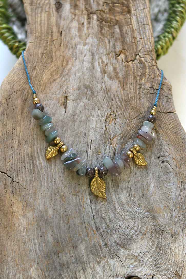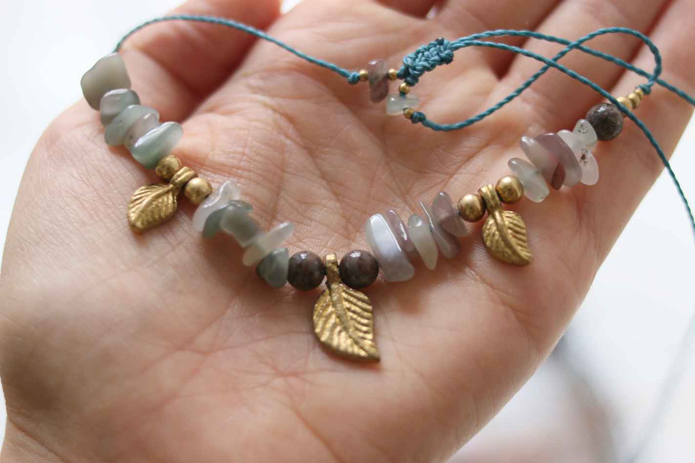 Käsin koottu kaulakoru, jossa sinisen akaatin rauhoittava energia kohtaa bronziitin maadoittavan voiman. Messinkiset lehdet symboloivat kasvua ja yhteyttä luontoon. Elegantti ja harmoninen koru, joka hehkuu metsän hiljaisuutta ja sisäistä tasapainoa. Kaulakorussa on säädettävä ympärysmitta. Materiaalina: vahattu puuvillanaru, messinkiset korunosat sekä akaatti-sirut ja bronziitti-helmet. HUOM! Voit valita tuotteelle joko noudon kivijalkaliikkeestä (Kirkkokatu 2, Vihreä Huone, Oulu) tai postituksen kotimaahan. Jos valitset postituksen, lisää ostoskoriin Toimitukset kategoriasta "pieni toimitus kotimaa XXS". Ostat siis 2 tuotetta: sekä korun että postituksen sille. Jos sinulle tulee kysyttävää, voit laittaa viestiä instagramissa @bypetrakatariina tai sähköpostia: bypetrakatariina@gmail.com