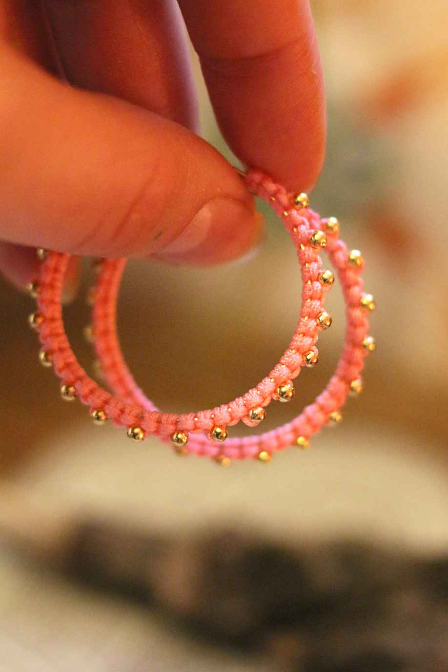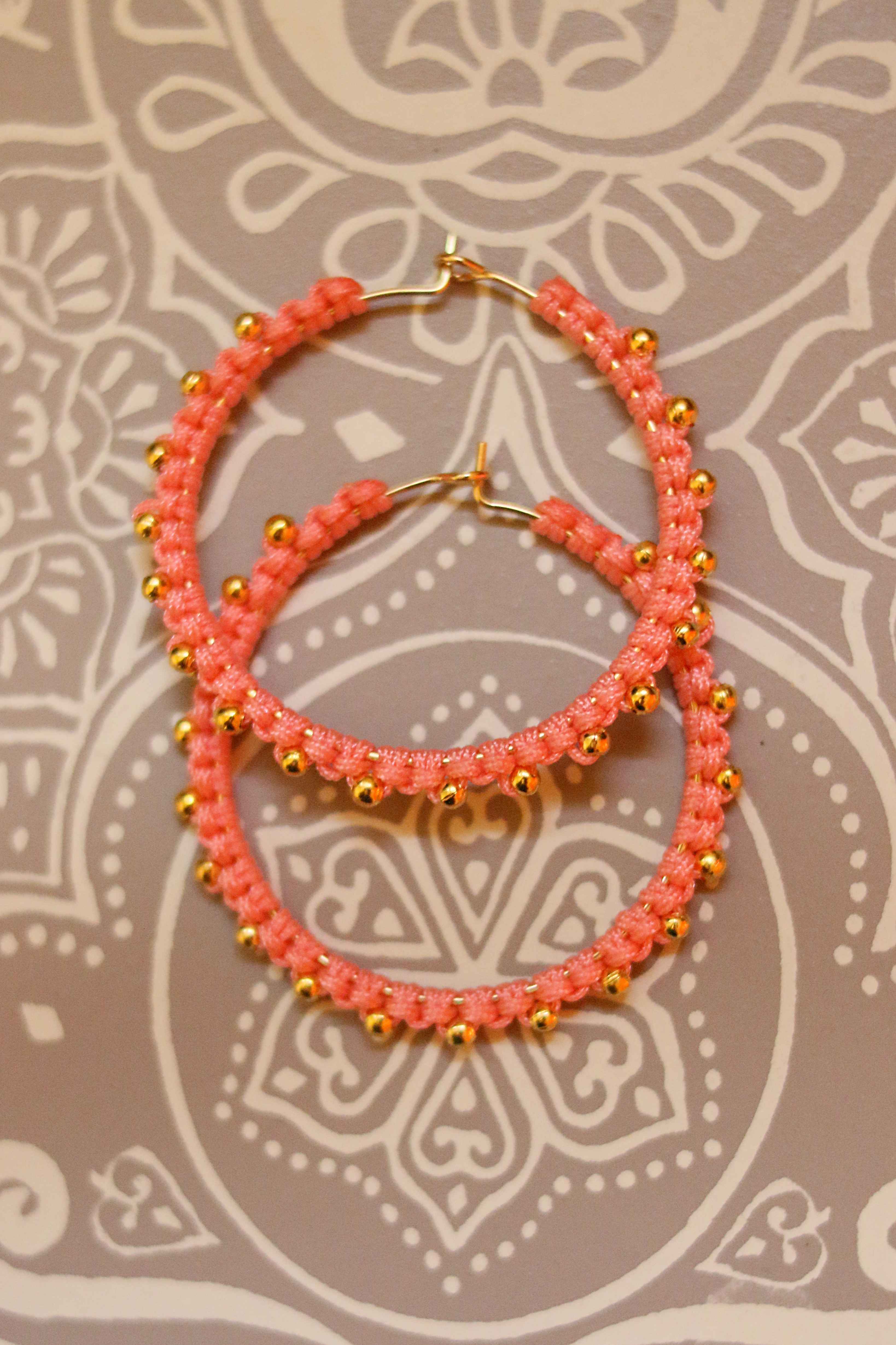 Akryylihelmiä sisältävät korut nyt poistohinnalla! Makramee tekniikalla valmistetut korvakorut korallinvärisellä langalla ja kultaisilla korunosilla. Materiaalina nylon nyöri, ruostumaton teräs sekä akryylihelmet. Renkaan halkaisija 35 mm.