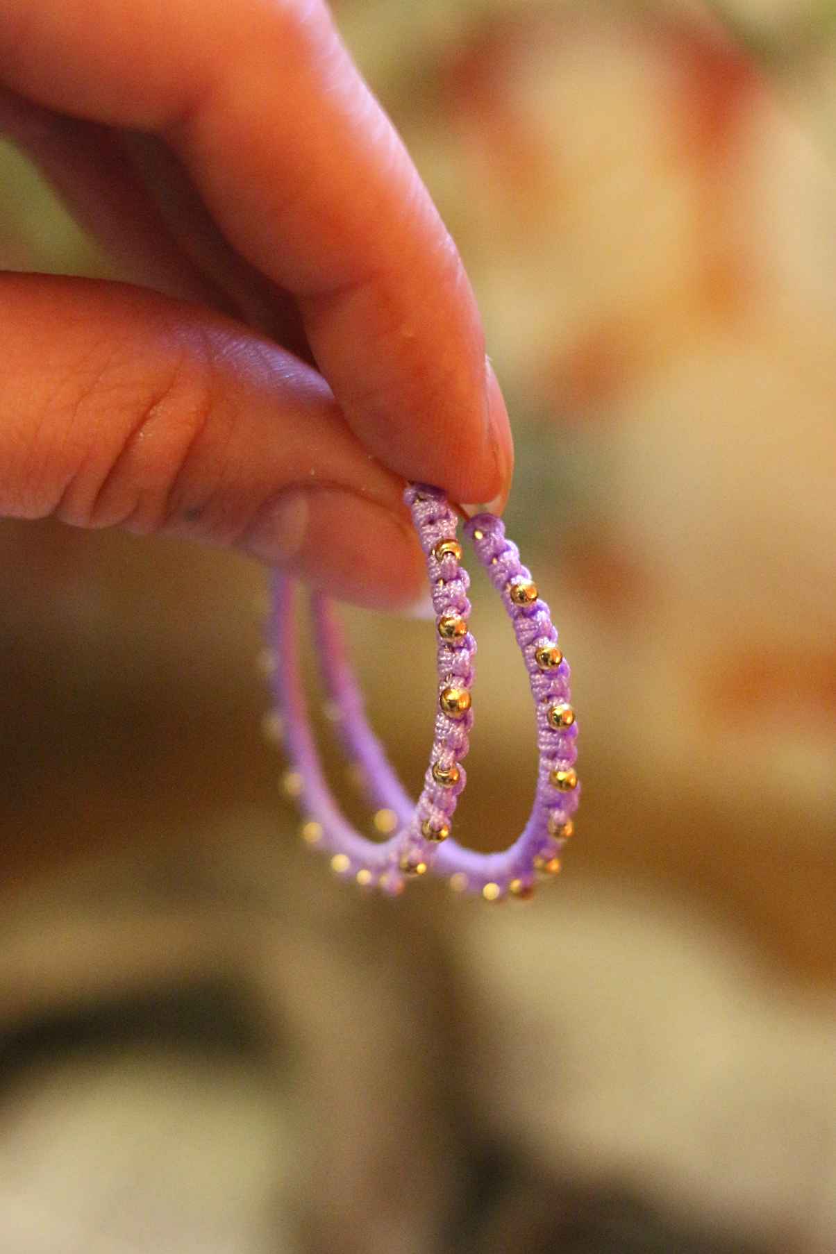 Akryylihelmiä sisältävät korut nyt poistohinnalla! Makramee tekniikalla valmistetut korvakorut lilan värisellä langalla ja kultaisilla korunosilla. Materiaalina nylon nyöri, ruostumaton teräs sekä akryylihelmet. Renkaan halkaisija 35 mm.