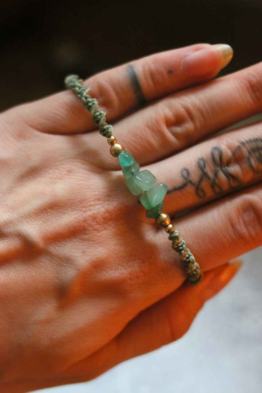 Käsin solmittu vaalean vihreä makramee-rannekoru, jota koristavat kauniit vihreän aventuriinin sirut ja pienet kullanhohtoiset messinkihelmet. Vihreä aventuriini tunnetaan rauhoittavana, harmonisoivana ja lempeänä sydänchakran kivenä. HUOM! Voit valita tuotteelle joko noudon kivijalkaliikkeestä (Kirkkokatu 2, Vihreä Huone, Oulu) tai postituksen kotimaahan. Jos valitset postituksen, lisää ostoskoriin Toimitukset kategoriasta "pieni toimitus kotimaa XXS". Ostat siis 2 tuotetta: sekä korun että postituksen sille. Jos sinulle tulee kysyttävää, voit laittaa viestiä instagramissa @bypetrakatariina tai sähköpostia: bypetrakatariina@gmail.com