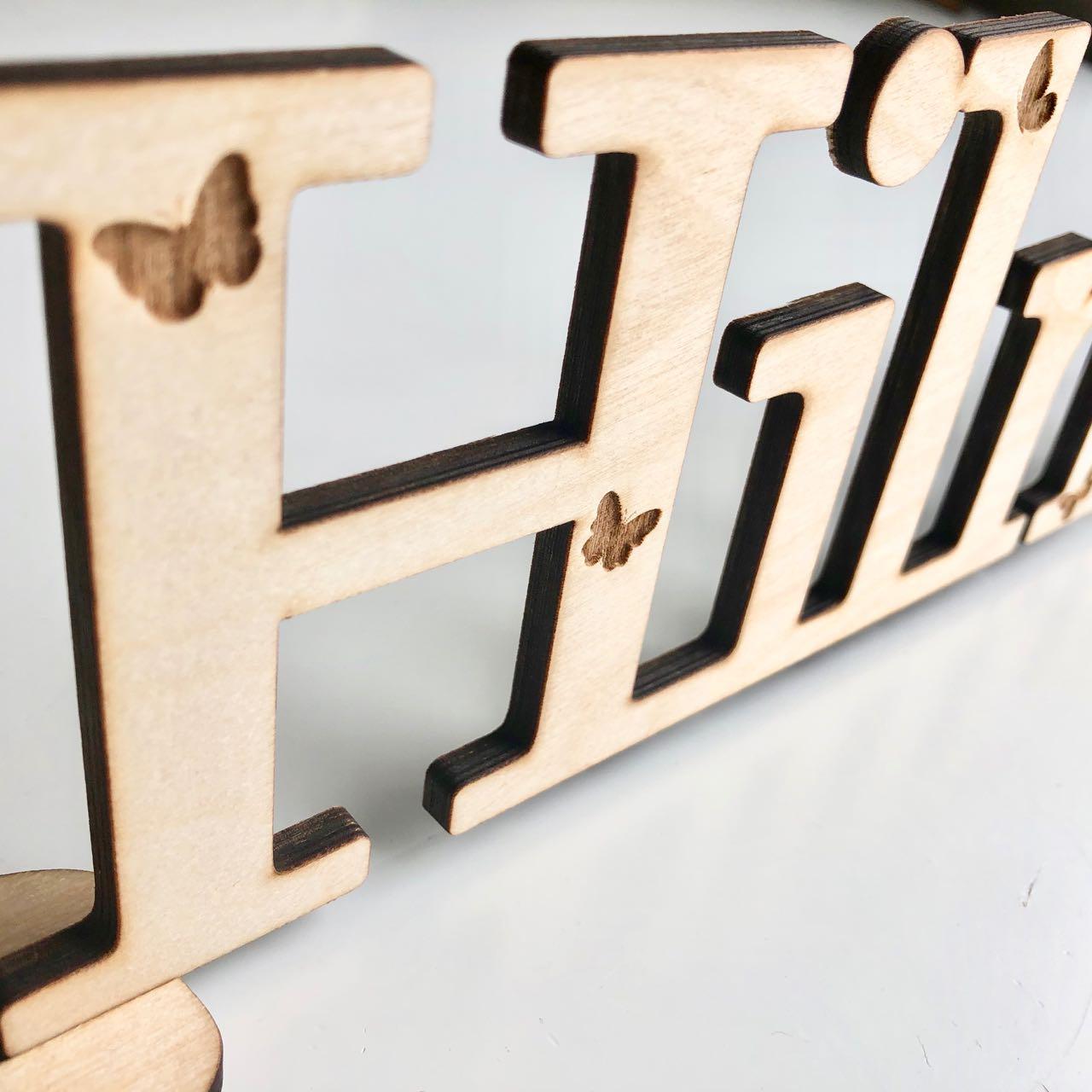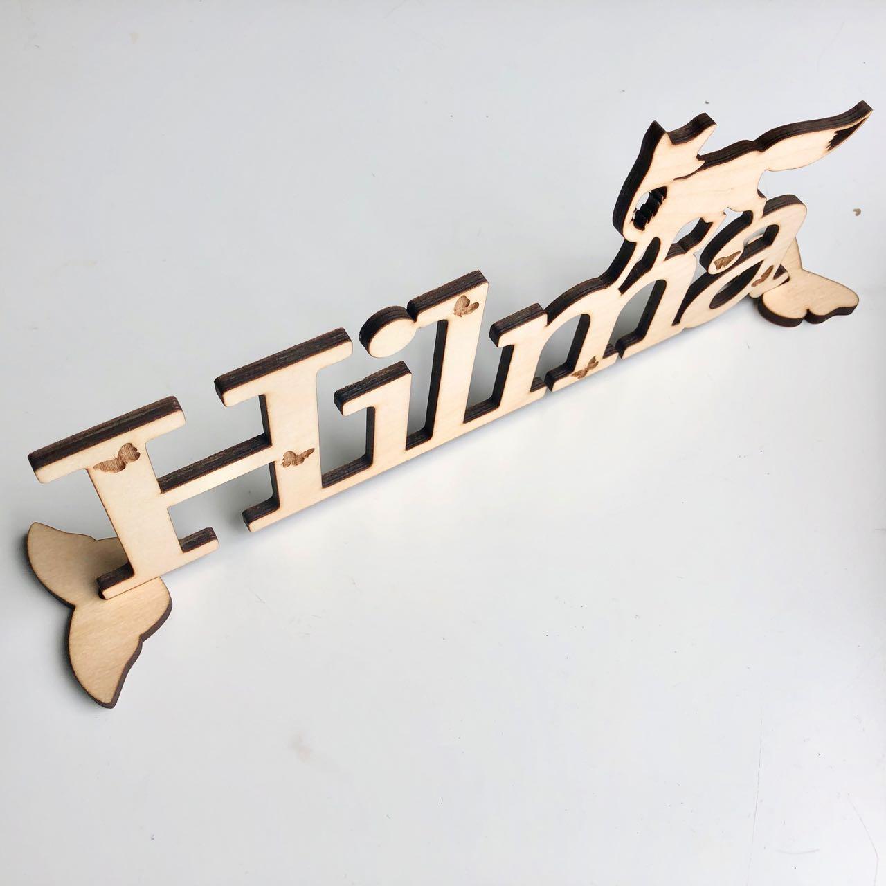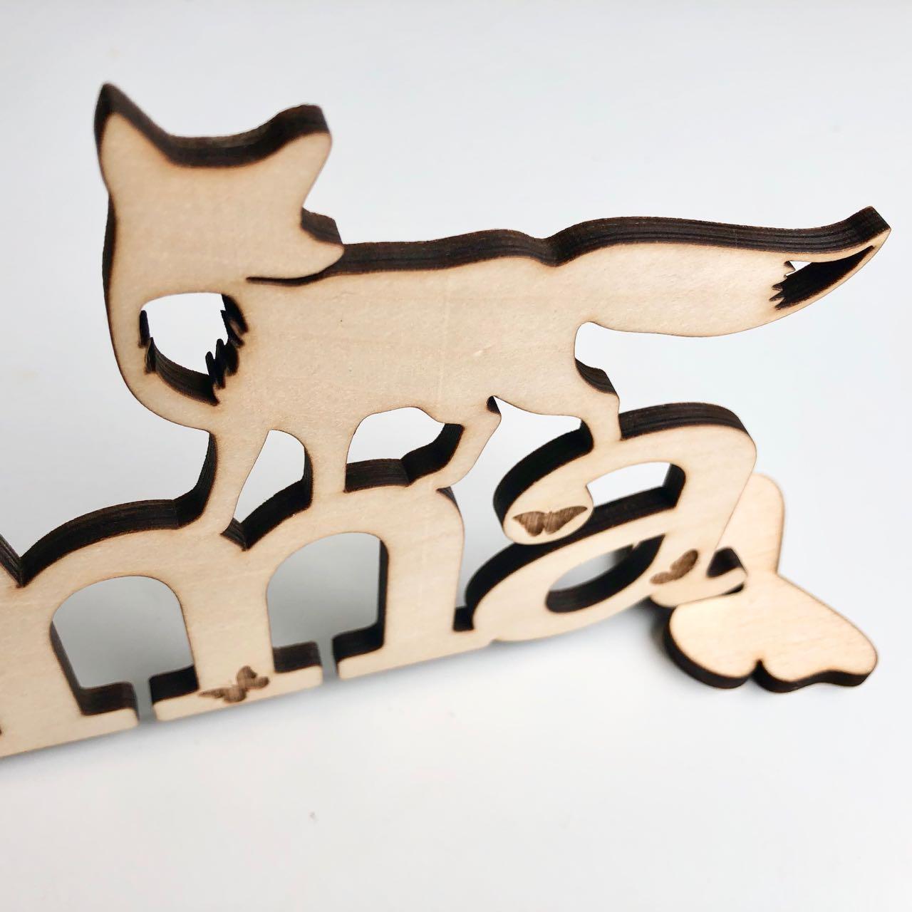 Kaunis ja leikkisä nimikyltti. Kyltissä kaiverretut perhoset kirjaimissa, sekä kettu hahmo kirjaimien päällä. Kyltti kustomoidaan siihen tulevaan tekstiin sopivaksi. Kyltin voi ripustaa seinälle kaksipuolisella teipillä tai laittaa pöydälle mukana tulevien pidikkeiden avulla. Käsitelty parafiini öljyllä. Idea lastenhuoneen oveen tai pöydälle ripustettavasta kyltistä sai alkunsa lahjaideasta. Nyt erilaisia kylttejä on jo useampi ja ne tuovat iloa monelle lapselle ja aikuiselle. Lev. n.40cm, koivuvaneria. Kirjoita tilauksen yhteydessä nimikylttiin tuleva nimi / teksti.