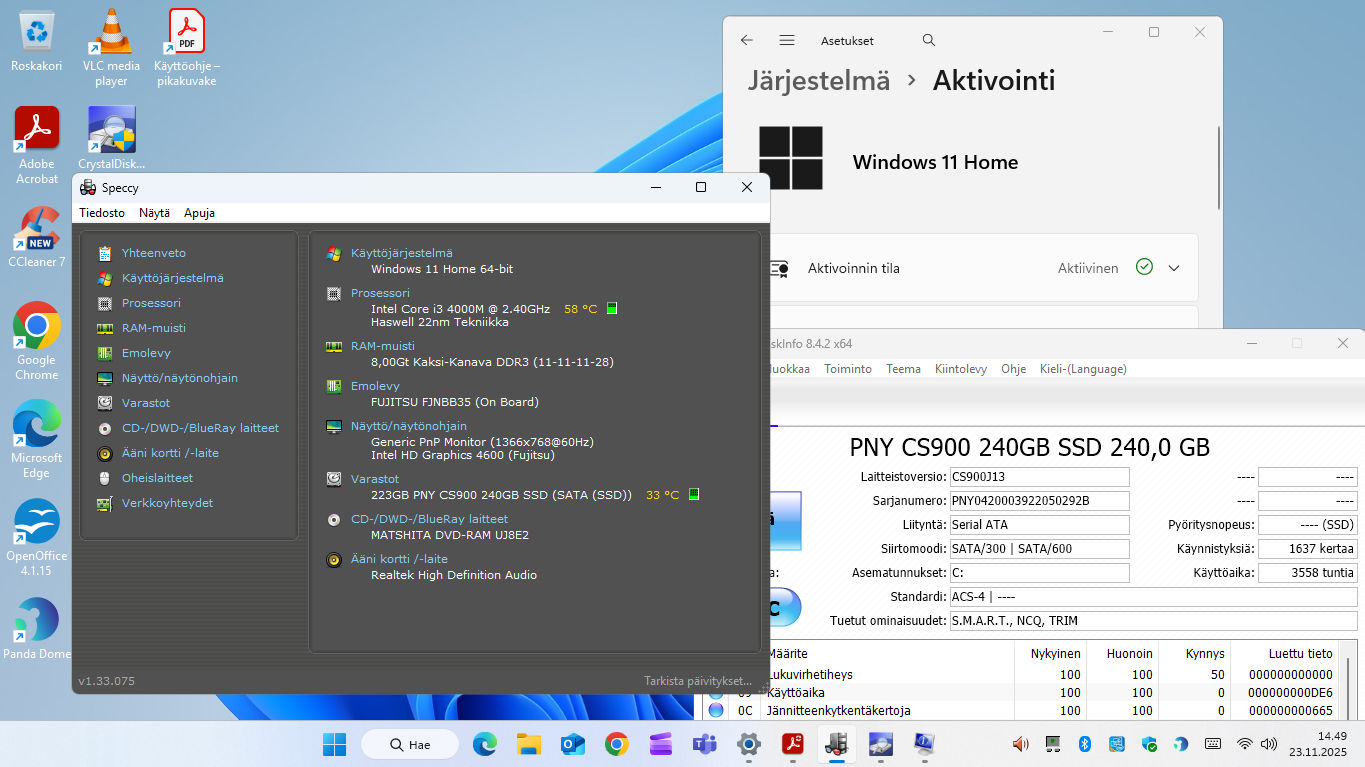 • Levy: PNY CS900 240GB SSD (hyvä kunto, lämpö 33°C)