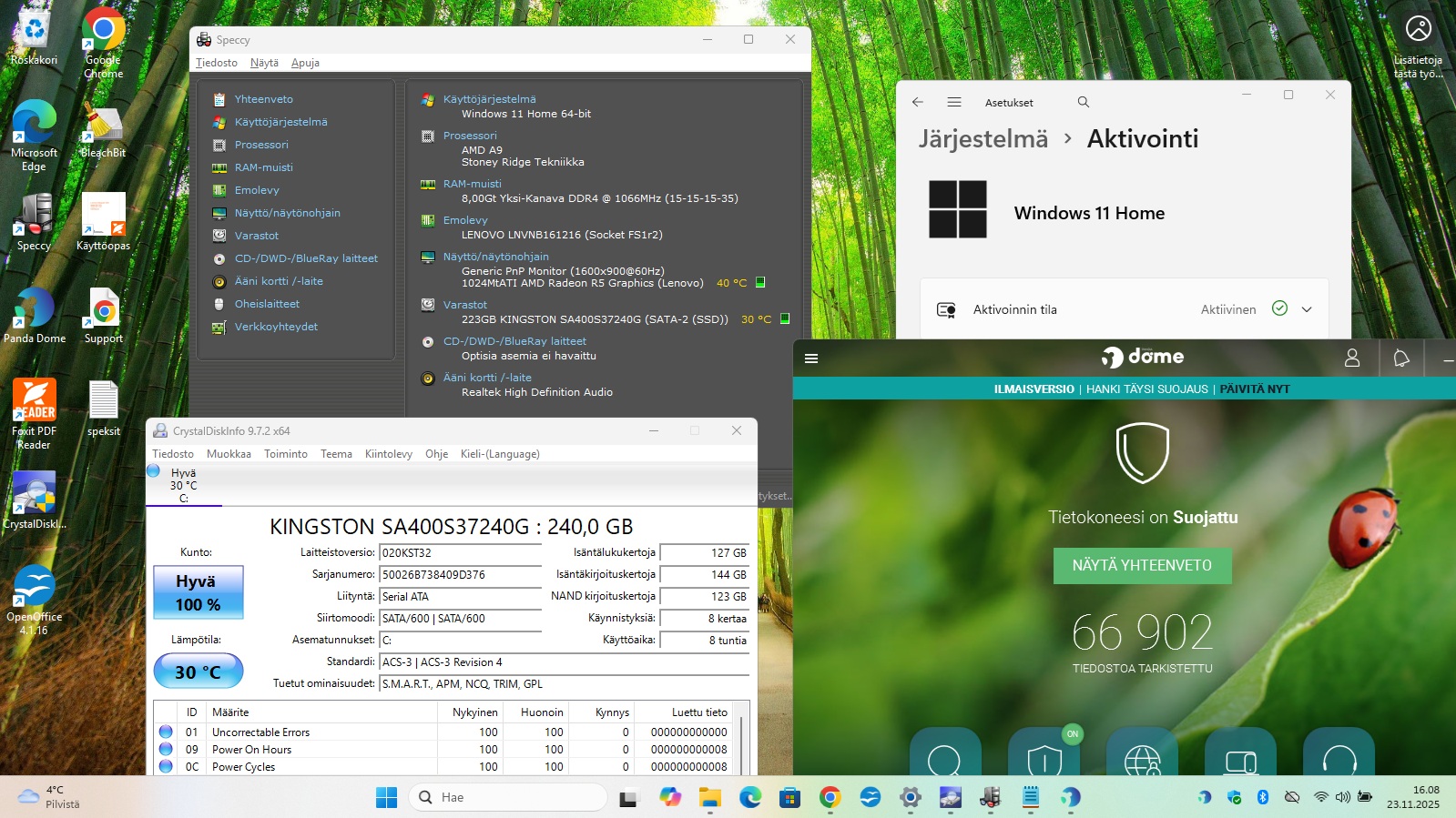 Windows 11 25h2 Home suomenkielinen -käyttöjärjestelmä Open Office, Foxit Reader, Panda tietoturva, BleachBit siivous yms perusohjelmat valmiina. Kytke päälle, liitä nettiyhteys ja ala käyttämään