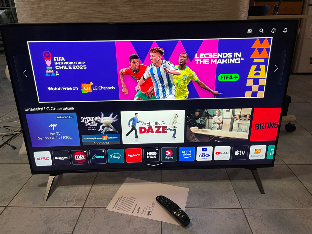 Netflix, YouTube, Disney+, HBO Max, Prime Video, Apple TV, Viaplay, Elisa Viihde, Yle Areena, MTV Katsomo, Ruutu, Rakuten TV sekä LG Channels (ilmaisia nettilähetyksiä). Maksulliset palvelut vaativat tilauksen ja kotimaisetkin vähintään kirjautumisen.