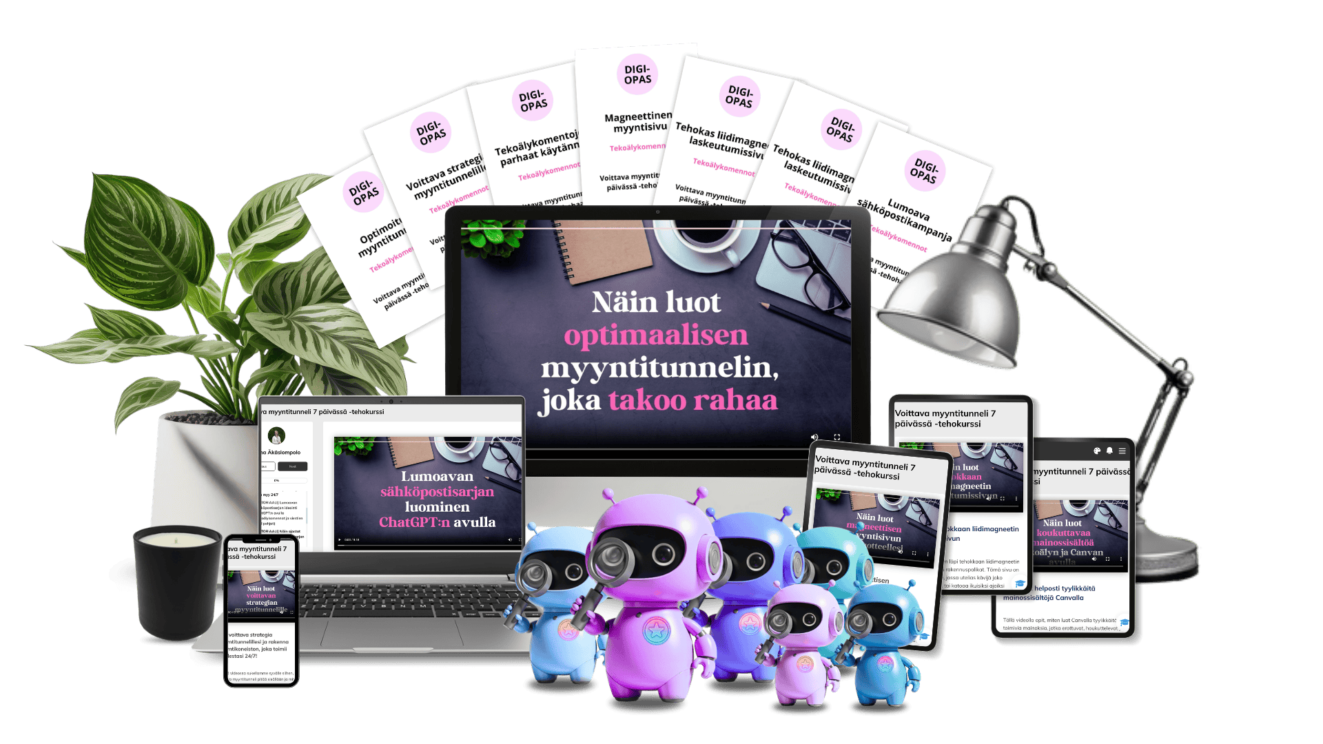 🚀 7 päivän teho-ohjelman, jonka aikana rakennetaan voittava myyntitunneli askel askeleelta 🚀 Tekoälyapurien myyntitiimin tukemaan jokaisessa vaiheessa 🚀 6 bonustyökalua (tutoriaaleja, digioppaita ja mallipohjia)