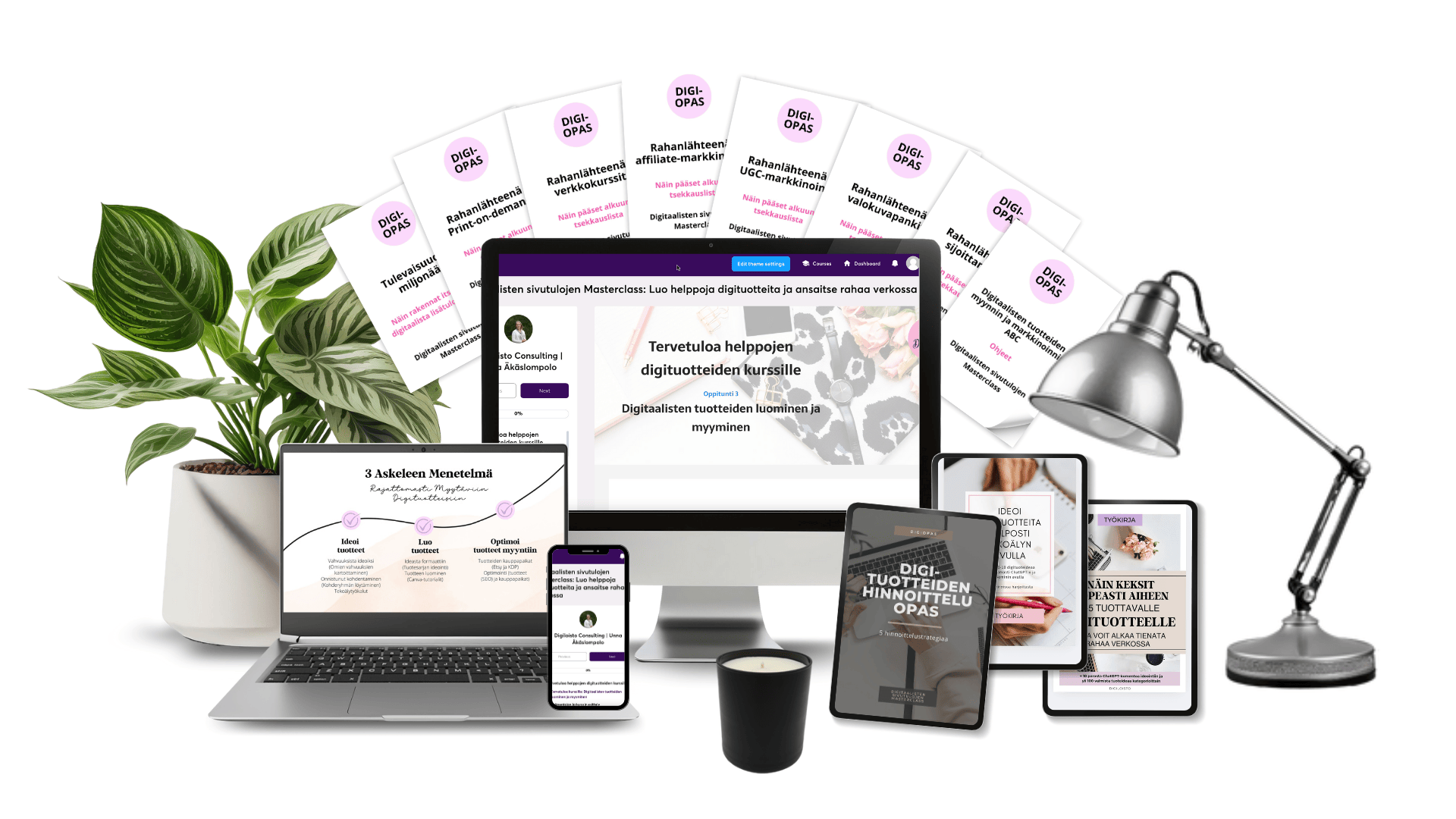 Tällä 3 viikon kurssin jälkeen sinulla on ensimmäinen digituotteesi ideoituna, luotuna ja myynnissä netissä! Tavoitteena on, että oman sivubisneksen avulla voit ansaita passiivista lisätuloa sekä enemmän aikaa ja vapautta tärkeille asioille elämässä.