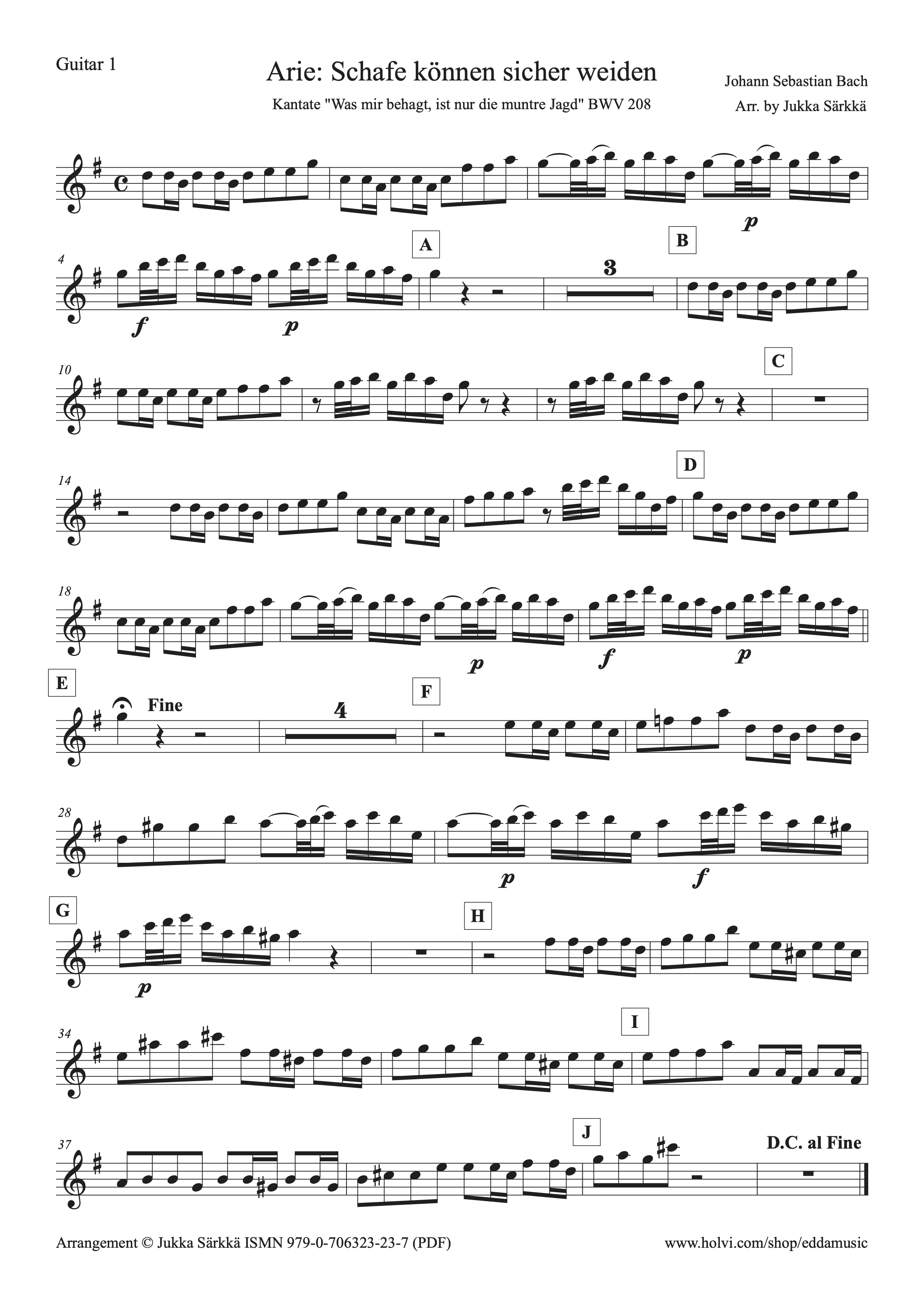 The beautiful aria 'Sheep may safely graze' from the cantata 'Was mir behagt, ist nur die muntre Jagd, BWV 208' by Johann Sebastian Bach, arranged for guitar quartet or guitar ensemble. You can download the arrangement immediately after payment. You will also receive an email with download instructions.