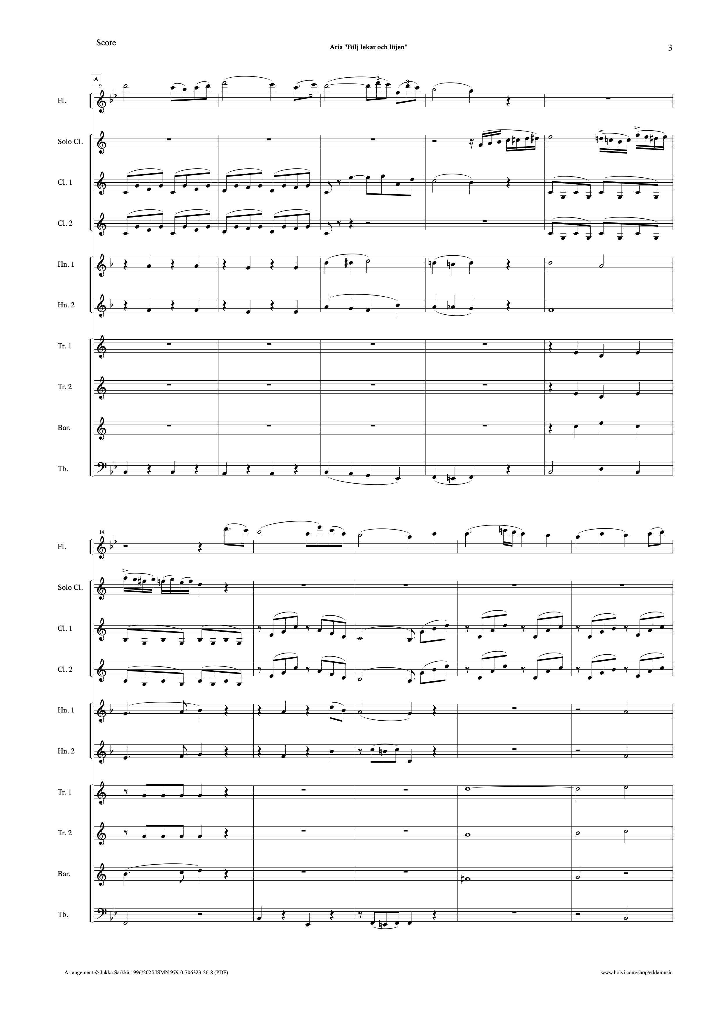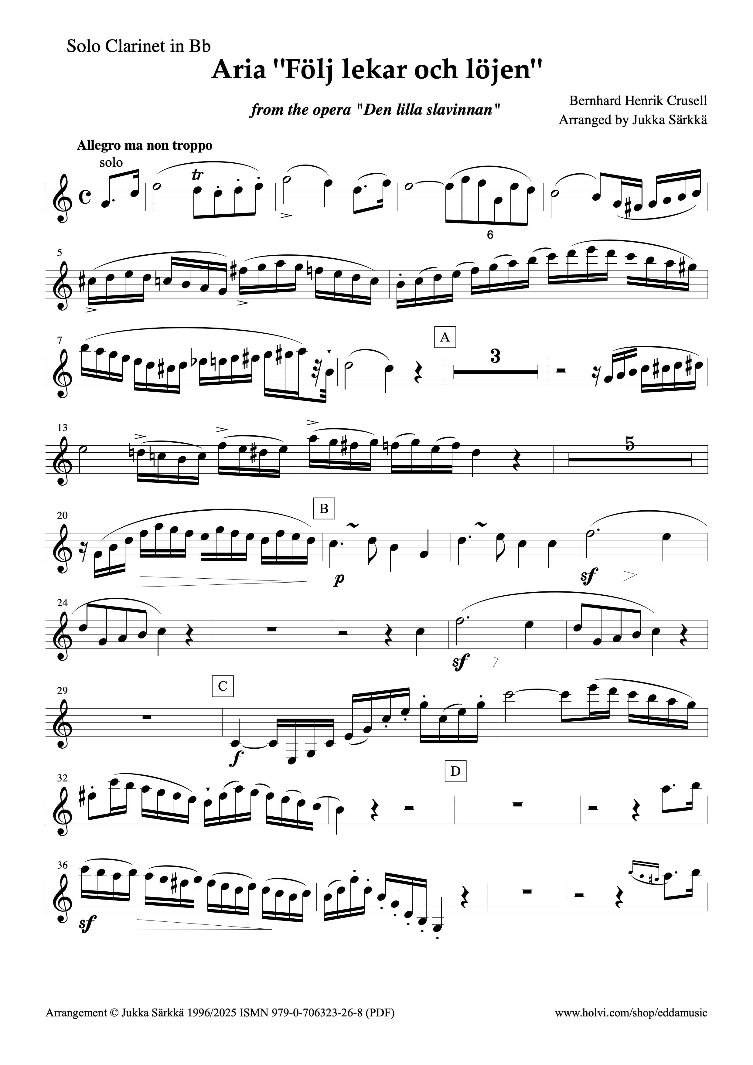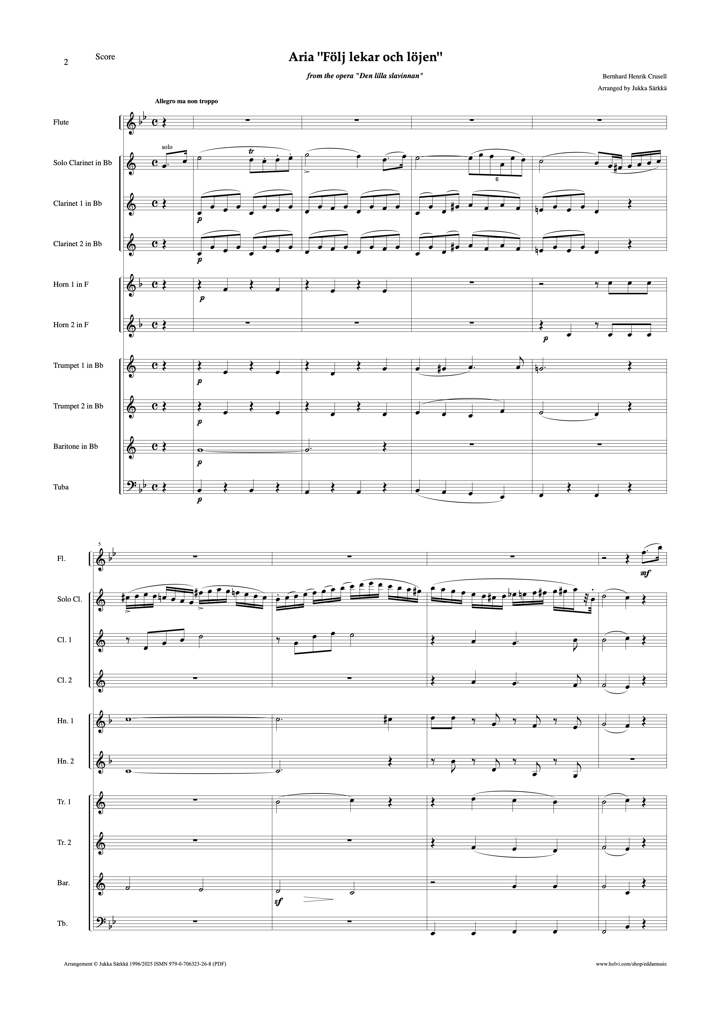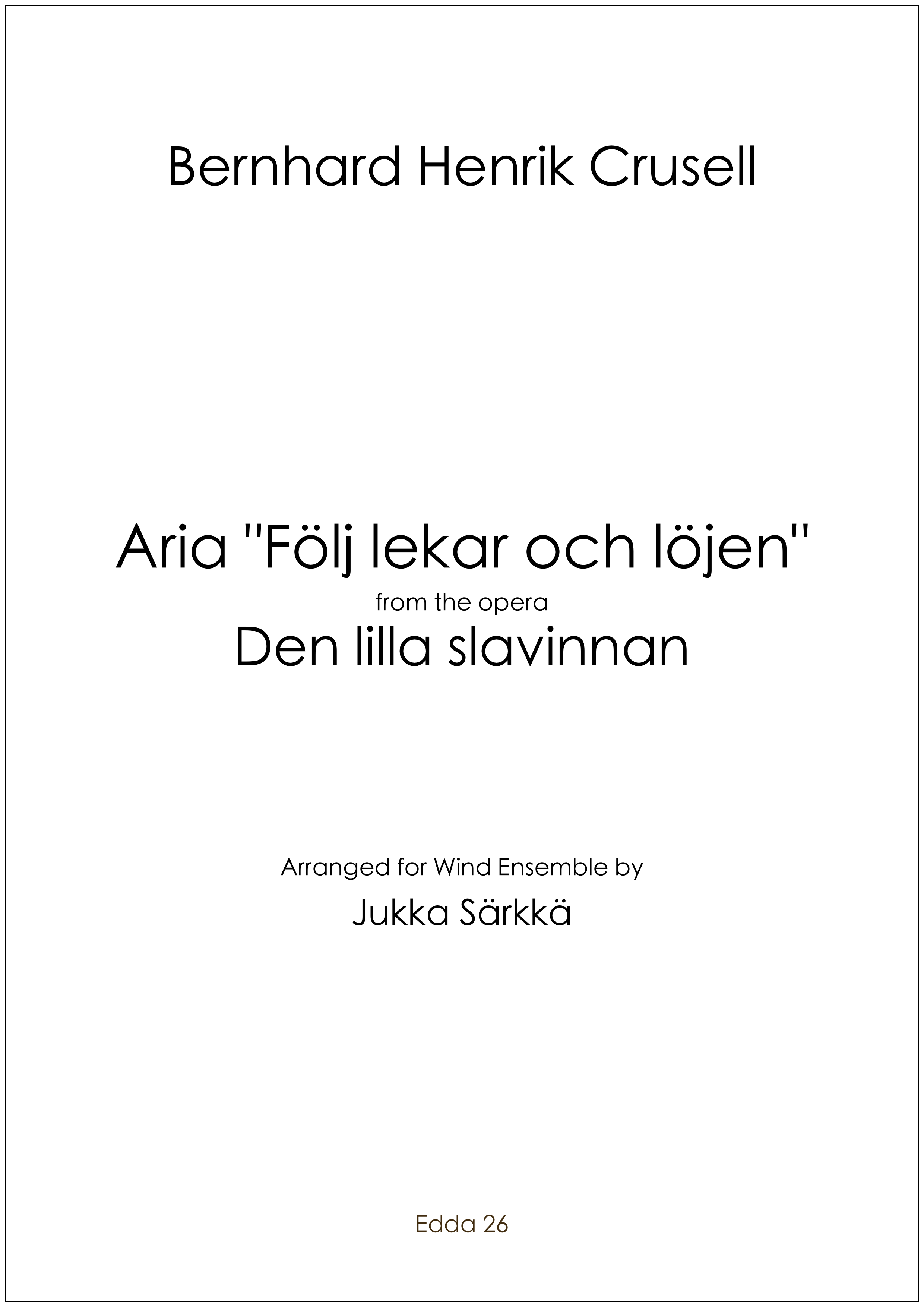 Benhard Henrik Crusell: Aaria oopperasta Pikku orjatar (Den lilla slavinnan) sovitettuna kymmenelle puhallinsoittimelle. Soitinnus: huilu, sooloklarinetti (obligato), klarinetti 1 & 2, käyrätorvi 1 & 2, trumpetti 1 & 2, baritone Bb, tuuba. Voit ladata musiikin heti maksun jälkeen. Saat myös sähköpostin, jossa on latausohjeet. Partituuri ja stemmat, 39 sivua.