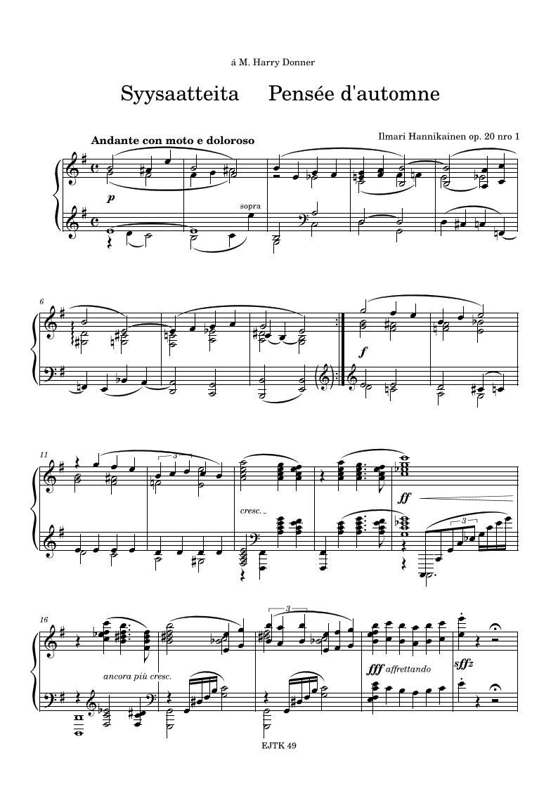 Suomalaisen pianisti-säveltäjän (1892-1955) kaunis, syvän alakuloinen tunnelmakappale, 2 nuottisivua. A beautiful, deeply melancholic piece by a Finnish pianist and composer (1892–1955), 2 pages of sheet music.