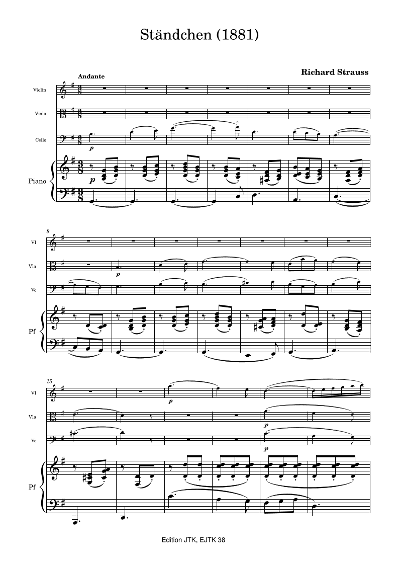 Monumentaalisten oopperoiden ja sinfonisten runojen säveltäjän (1864-1949) nuoruuden työ, melodinen ja levollisesti keinuva tunnelmakappale. Partituuri ja stemmat, yhteensä 16 nuottisivua. Riittävän helppo oppilasyhtyeille, erinomainen encore ammattilaisille. An early work by the composer of monumental operas and symphonic poems (1864–1949), a melodic and gently swaying piece of mood music. Score and parts, 16 pages of music in total. Easy enough for student ensembles, and an excellent encore for professionals.