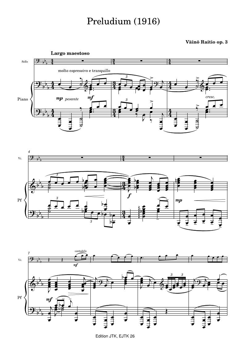 Suomalaisen säveltäjän (1891-1945) kehitysvaiheen työ matkalla perinteisestä romanttisesta ilmaisusta omintakeiseen modernimpaan ilmaisuus, kuohuvan mahtipontinen teos, 11 nuottisivua (partituuri ja sellonuotti) sekä 4 muuta sivua. The work of a Finnish composer (1891-1945) during his developmental phase, moving from traditional romantic expression to a more original, modern style, a turbulent, grandiose work, 11 pages of music (score and cello part) and 4 other pages.