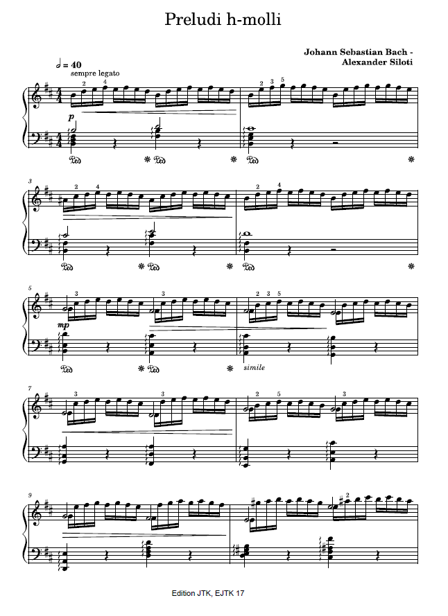Alexander Silotin sovitus J. S. Bachin Preludista, mm. Emil Gilelsin ja Grigori Sokolovin unohtumaton encore. 2 nuottisivua.