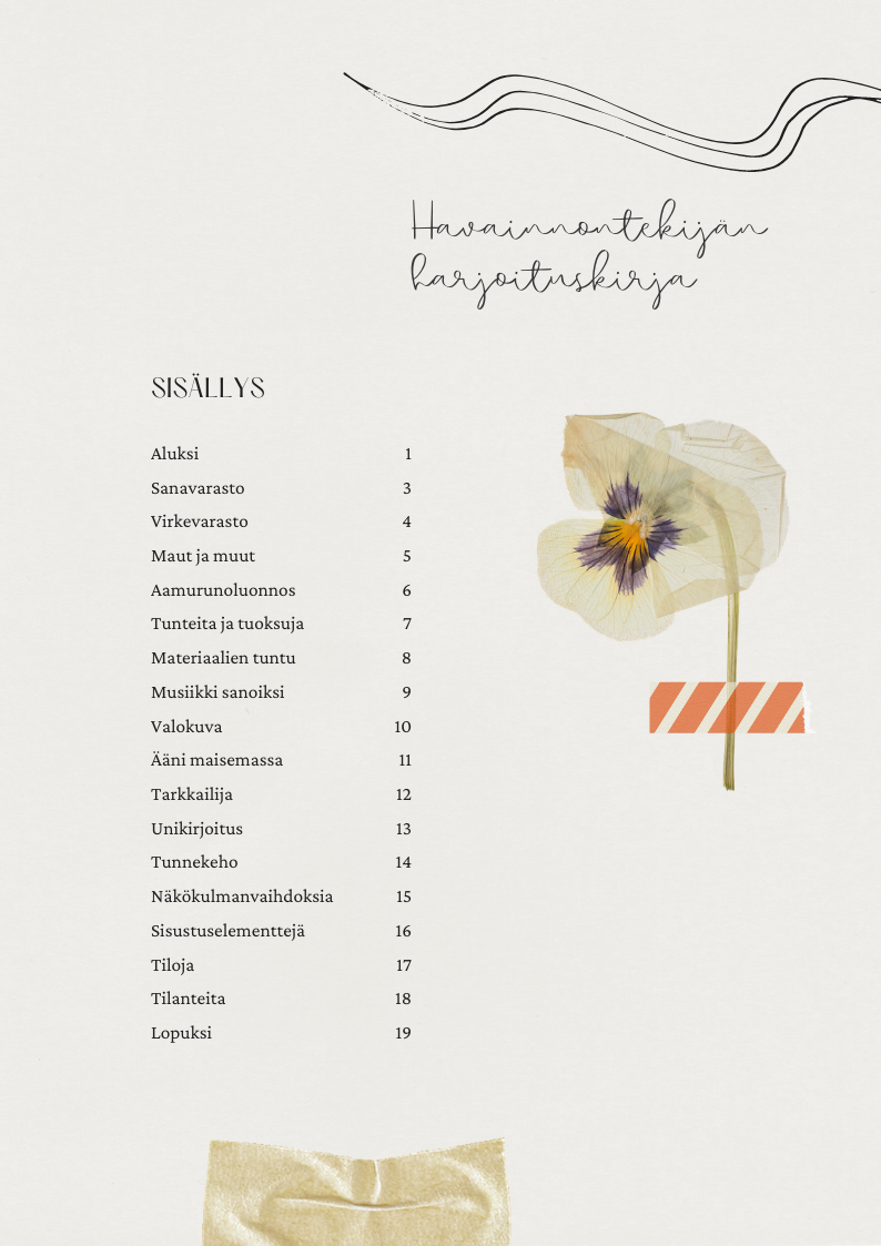 Miten kirjoittamista voi lähestyä havainnoinnin ja eri aistien kautta? Havainnontekijän harjoituskirja on ladattava e-opas, joka sisältää kirjoitusharjoituksia. Ne antavat sytykkeitä hetkiin, kun tekisi mieli kirjoittaa, muttei tiedä mistä.