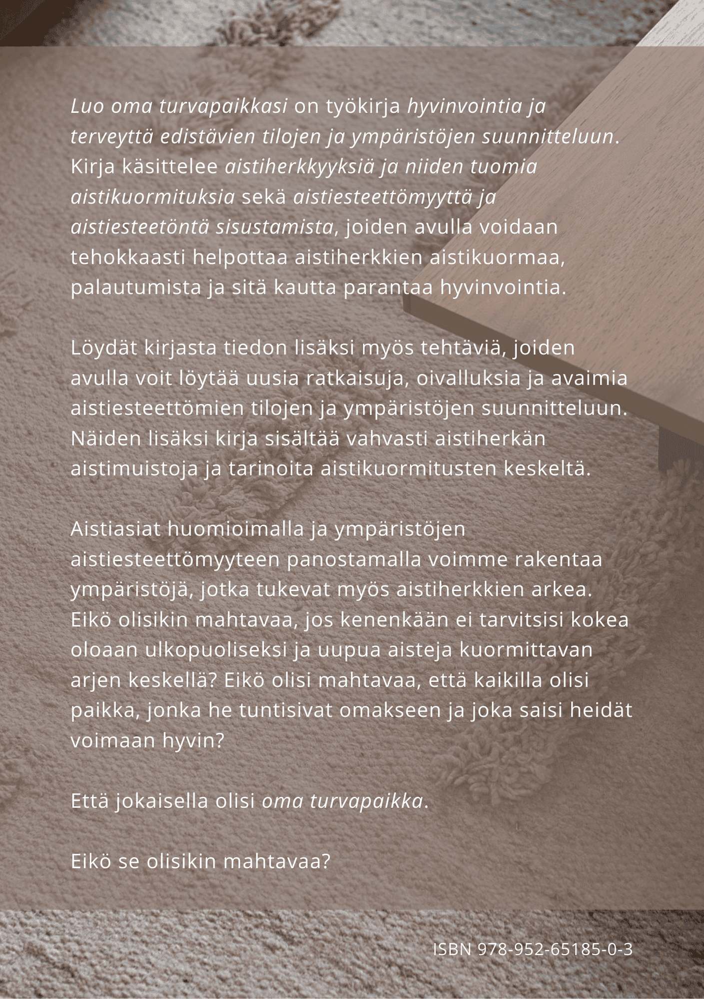 Luo oma turvapaikkasi on työkirja hyvinvointia ja terveyttä edistävien tilojen ja ympäristöjen suunnitteluun. Kirja käsittelee aistiherkkyyksiä ja niiden tuomia aistikuormituksia sekä aistiesteettömyyttä ja aistiesteetöntä sisustamista, joiden avulla voidaan tehokkaasti helpottaa aistiherkkien aistikuormaa, palautumista ja sitä kautta parantaa hyvinvointia.
