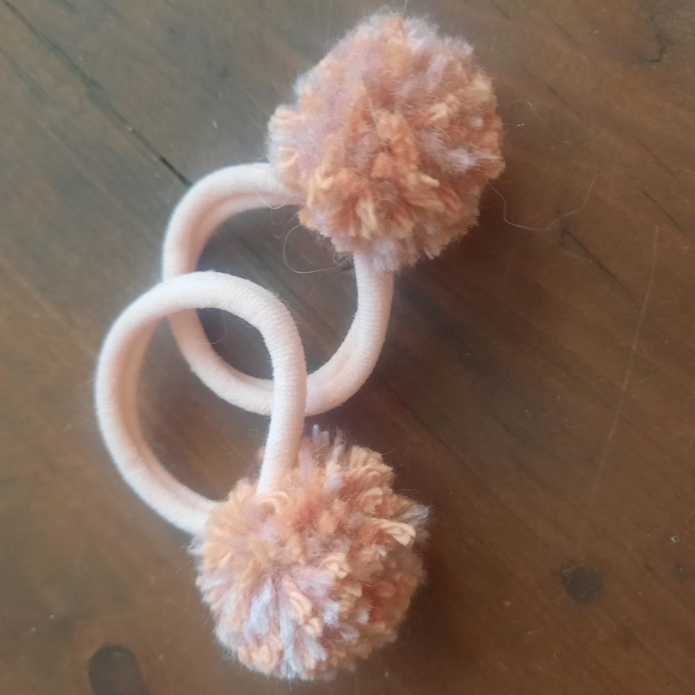Hauskat pompom populat hiuksiin, pompulat tehty jämälangoista.