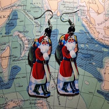 Ihanat vanhoista kiiltokuvista valmistetut korvakorut, taustana kierrätysnahka, koukut kirurginterästä. Koko 2x6cm.