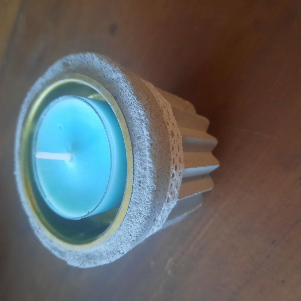 Betonista valmistettu tukeva tuikkualunen puutarhaan, käy myös sisäkäyttöön. Mallina käytetty hyytelömuottia, tässä mallissa pitsi koriste.