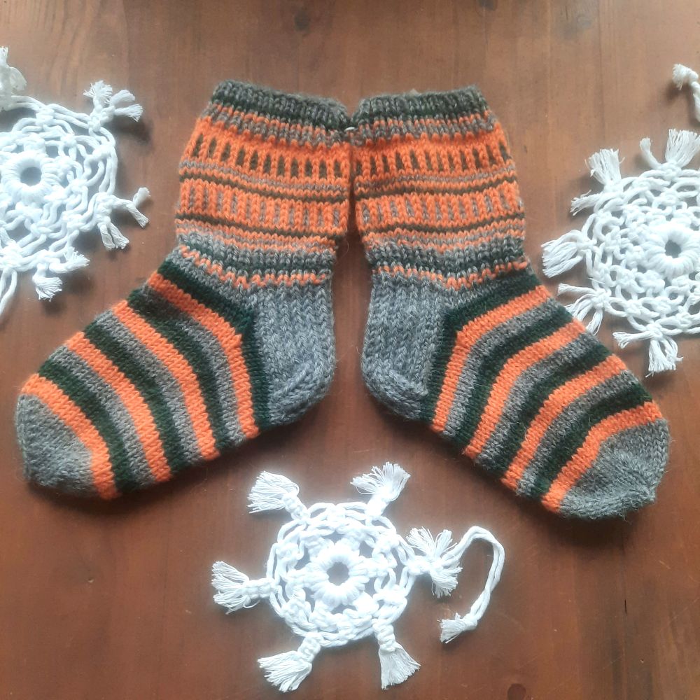 7- veljestä langasta neulotut Kuviosukat koko32-33. Varren pituus 10cm.