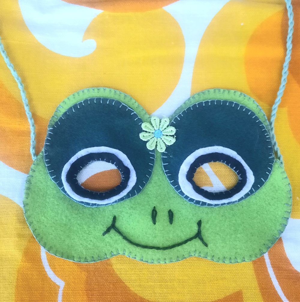 Huovasta tehty kestävä naamio leikkeihin, naru kiinnityksellä saadaan sopiva mitta pään kokoon.