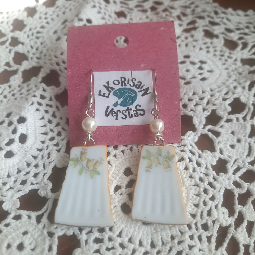 Säröisestä kukkalautasesta valmistetut korvakorut, koko 4x2cm, koukut kirurginterästä.