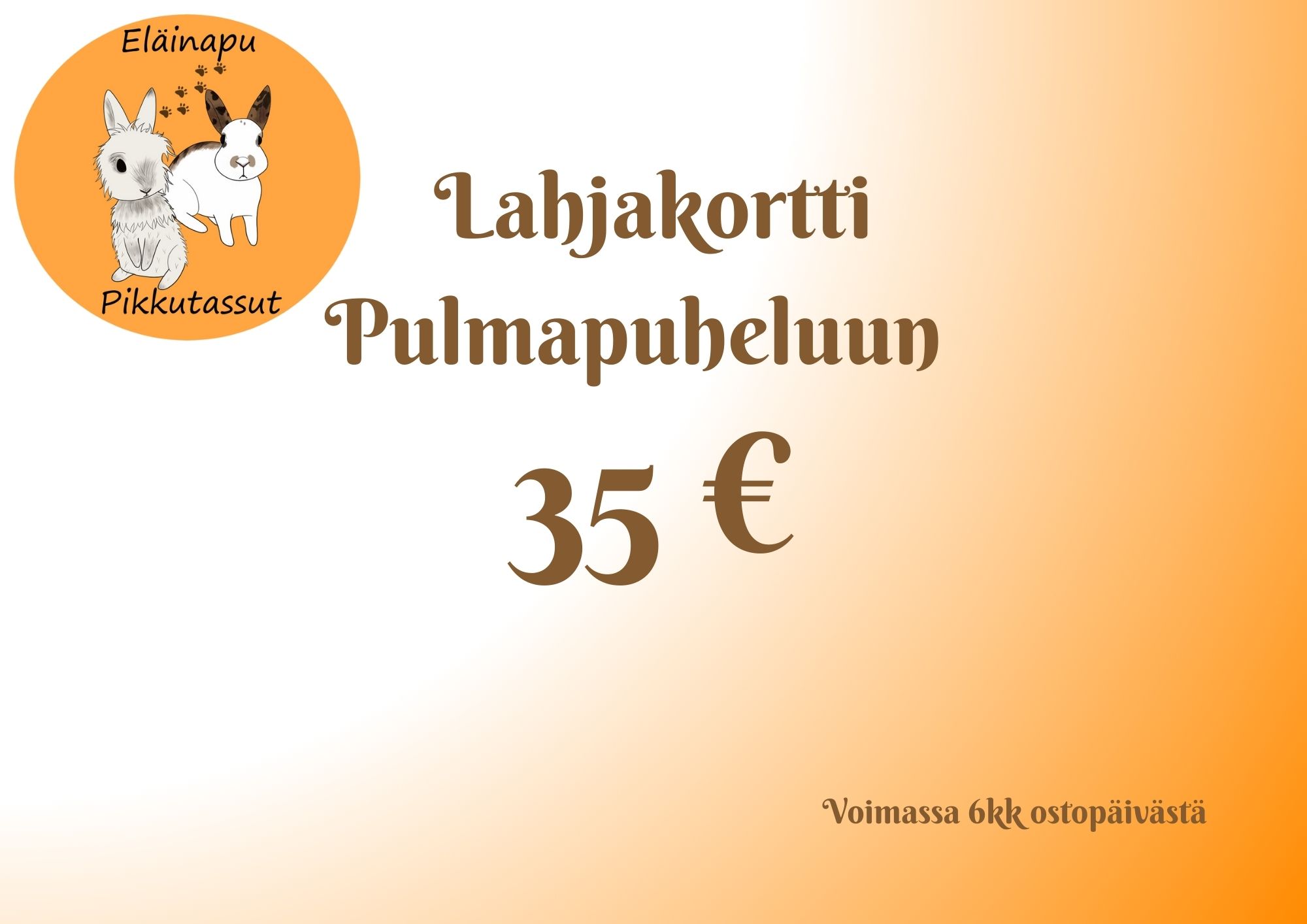 Lahjakortti toimitetaan omana PDF- tiedostonaan sähköpostiin. Lahjakortti on voimassa 6 kuukautta ostopäivästä eteenpäin.