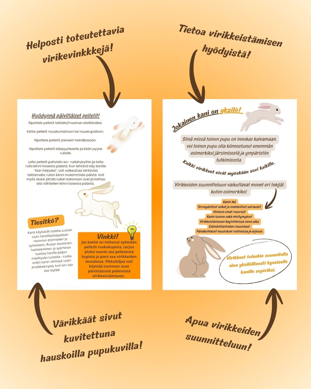 JOKA PUPUN VIRIKEOPAS on täysin ainutlaatuinen opas kanien virikkeistämisen saloihin! Oppaan avulla opit, miksi virikkeet ovat tärkeitä kanien hyvinvoinnille ja saat vinkkejä monipuolisen virikkeistämisen suunnitteluun. Löydät oppaasta myös helposti toteutettavia virikevinkkejä, joita voit lähteä kokeilemaan pupujesi kanssa!