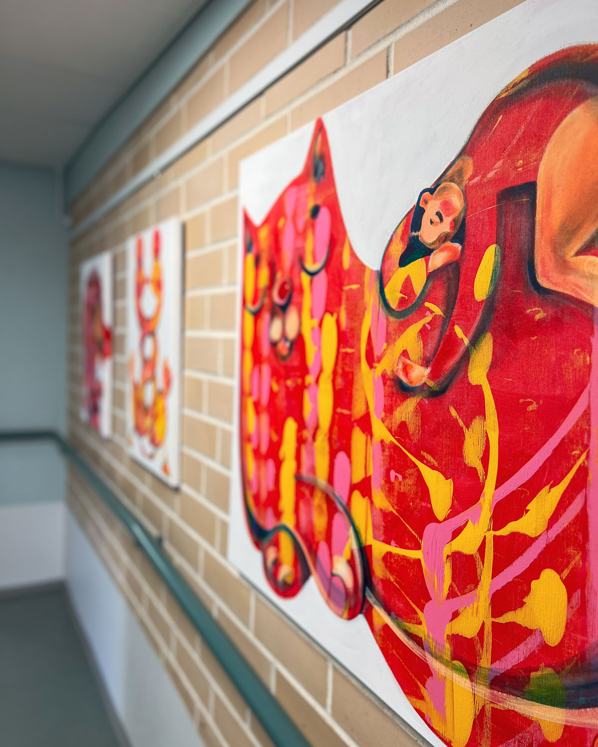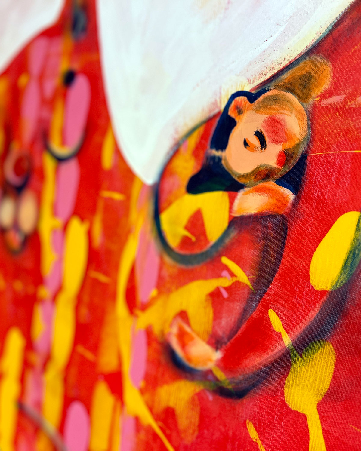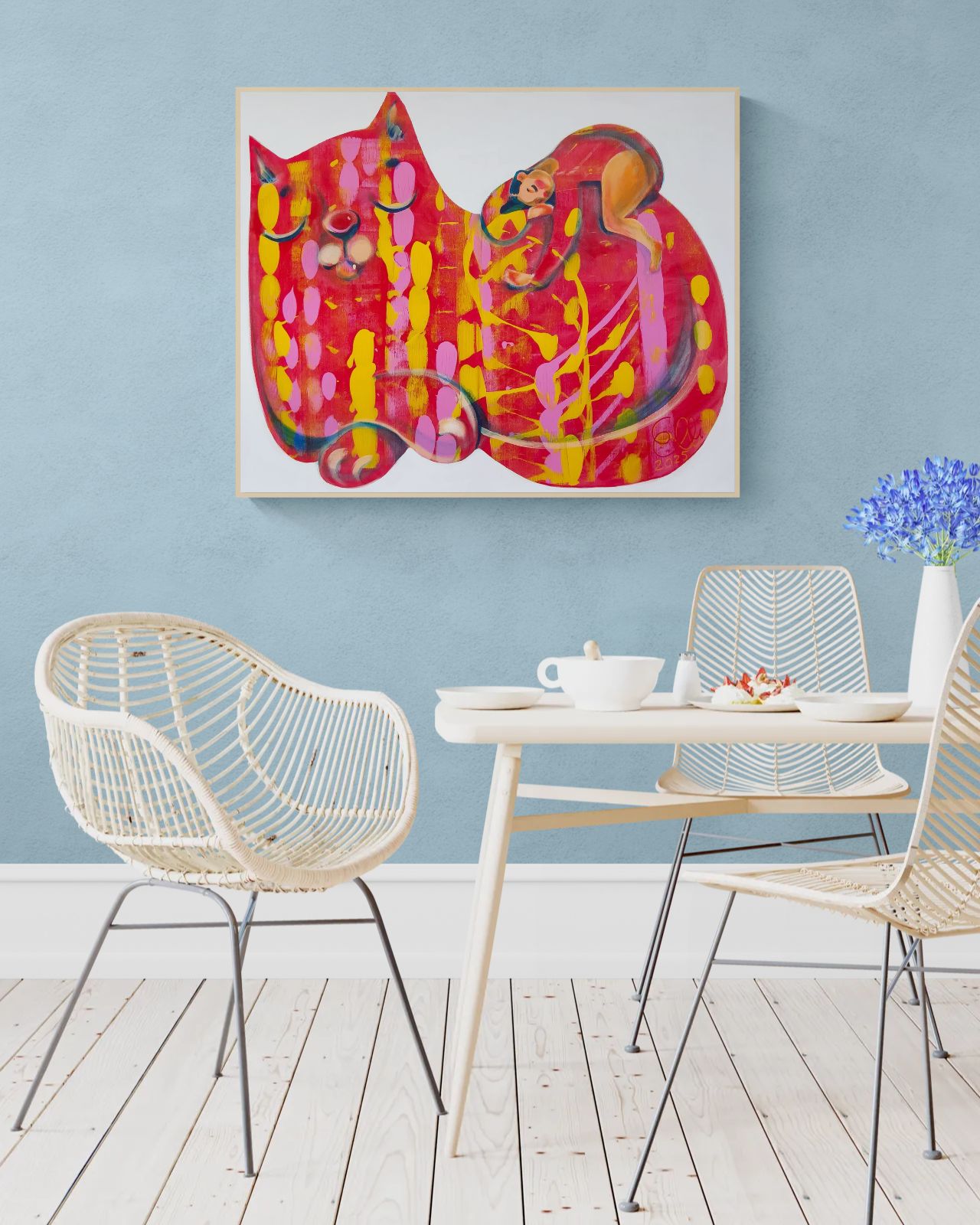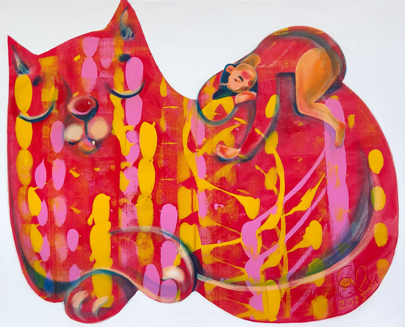 This artwork depicts a tender moment of napping with the artist’s cat, Cocco. Often curled up in Elli’s arms, the cat inspired this peaceful scene. The painting also reflects a playful thought: what it might feel like to be small enough to curl up in Cocco’s arms.