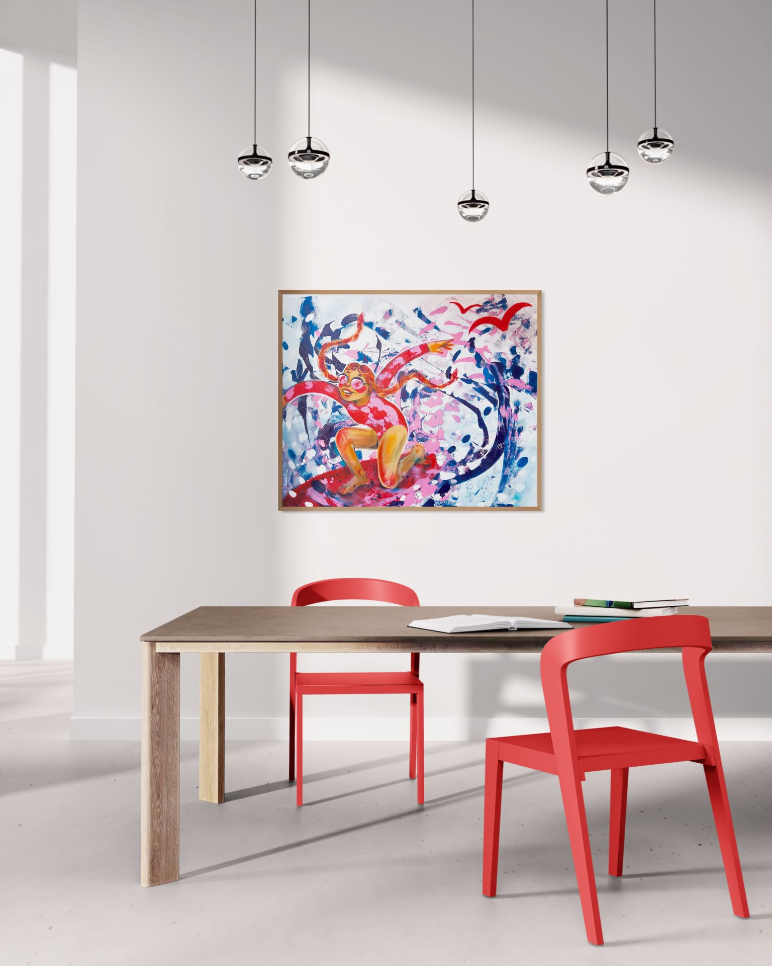 Expressive and full of movement, this vibrant artwork captures the exhilaration of surfing. The girl in the painting evokes the spirit of Pippi Longstocking.