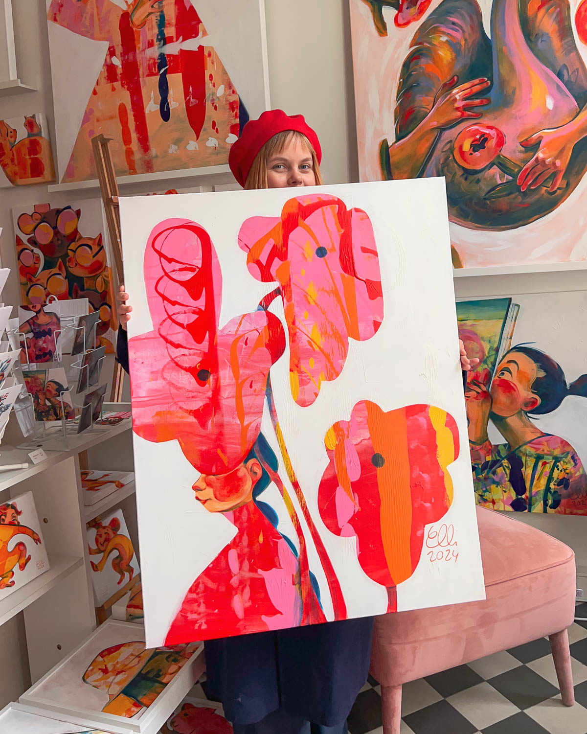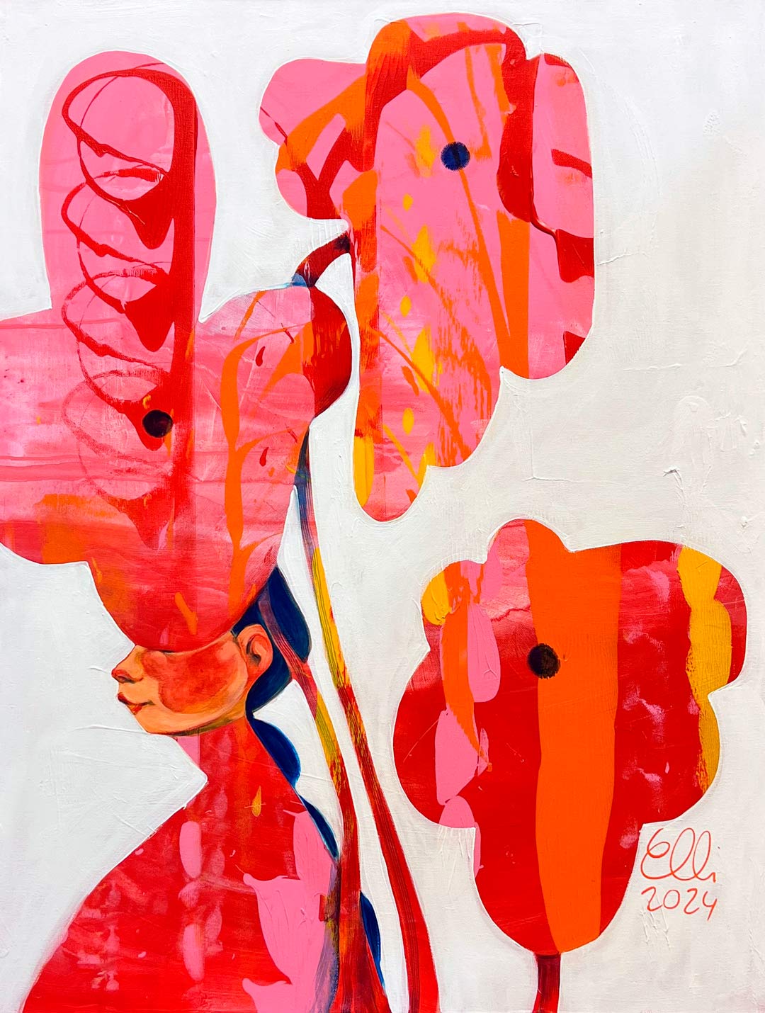 In Elli Maanpää’s painting “Hide and Seek” (70 x 90 cm), a girl finds refuge among oversized flowers.