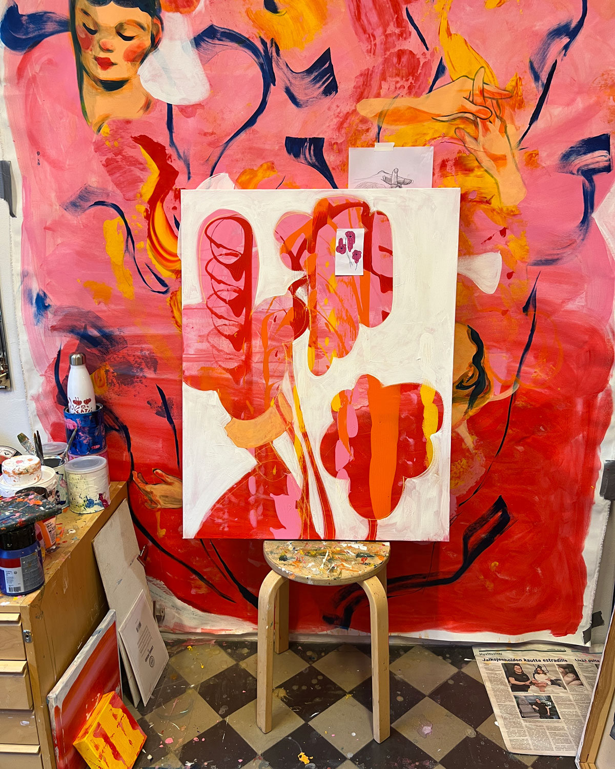 Taiteen tekeminen on itselleni suojakerros. Tämä maalaus sai inspiraationsa puhelinkeskustelun aikana luonnostelemista kukkasista. Puhelimessa puhuminen hermostuttaa minua, mutta luonnostelu sen aikana maadoittaa minua.