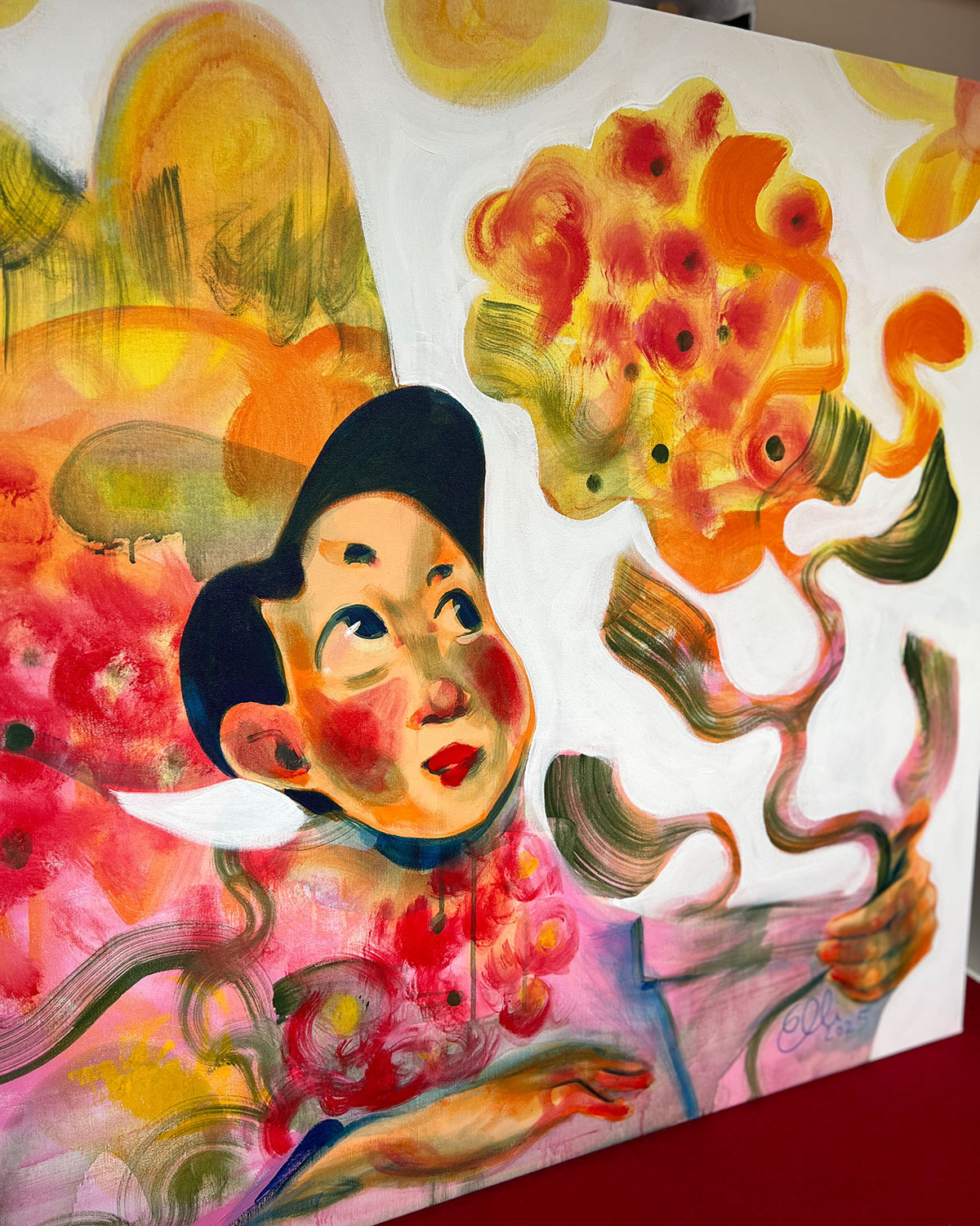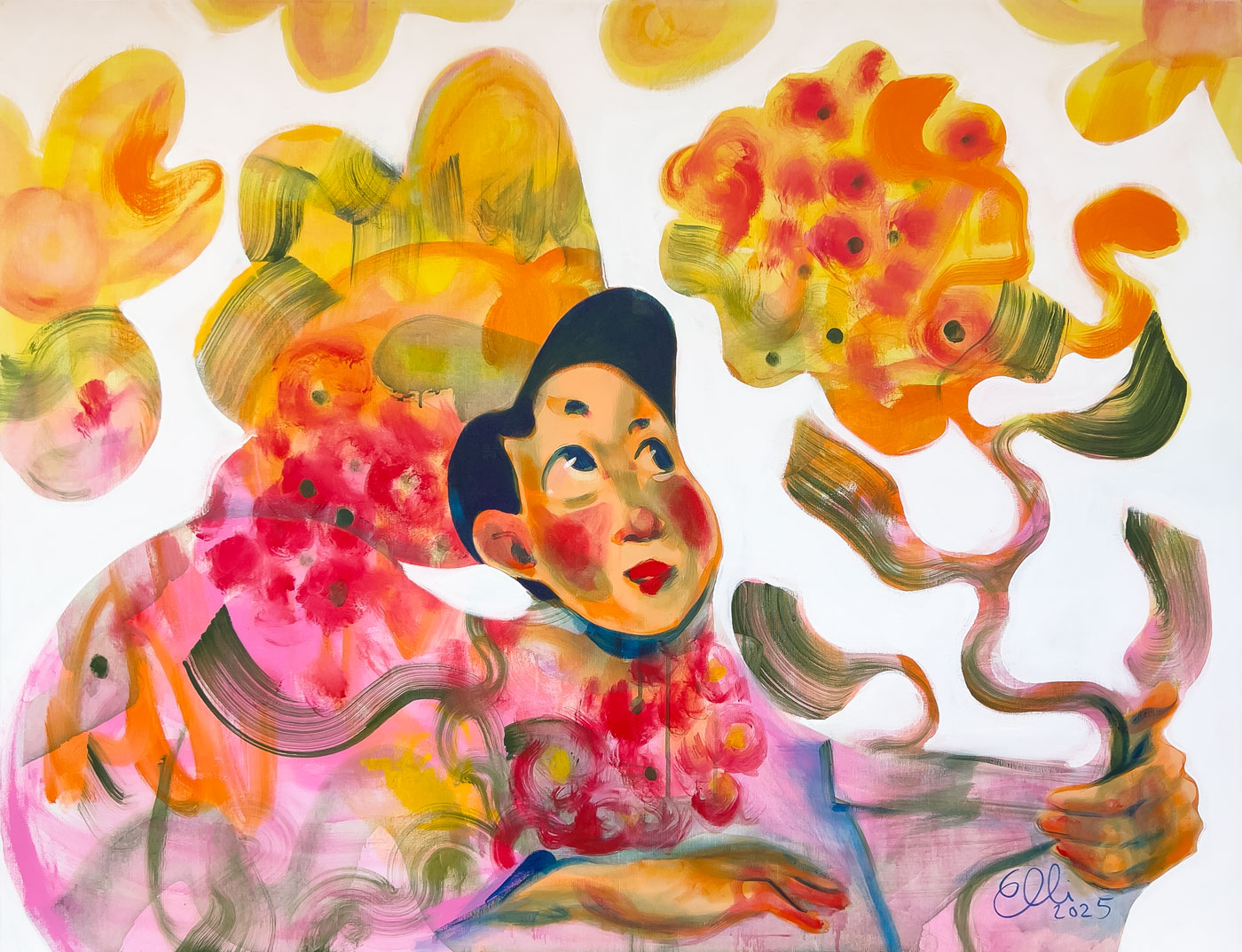 “It Was Always You” (89x116 cm) depicts a figure wearing a floral crown, gently admiring and holding a plant they have nurtured.