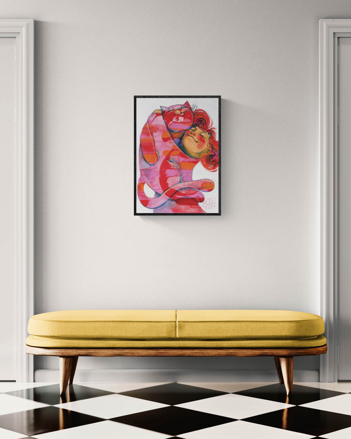 Punainen kissa ja tyttö halaavat toisiaan autuaan onnellisina.