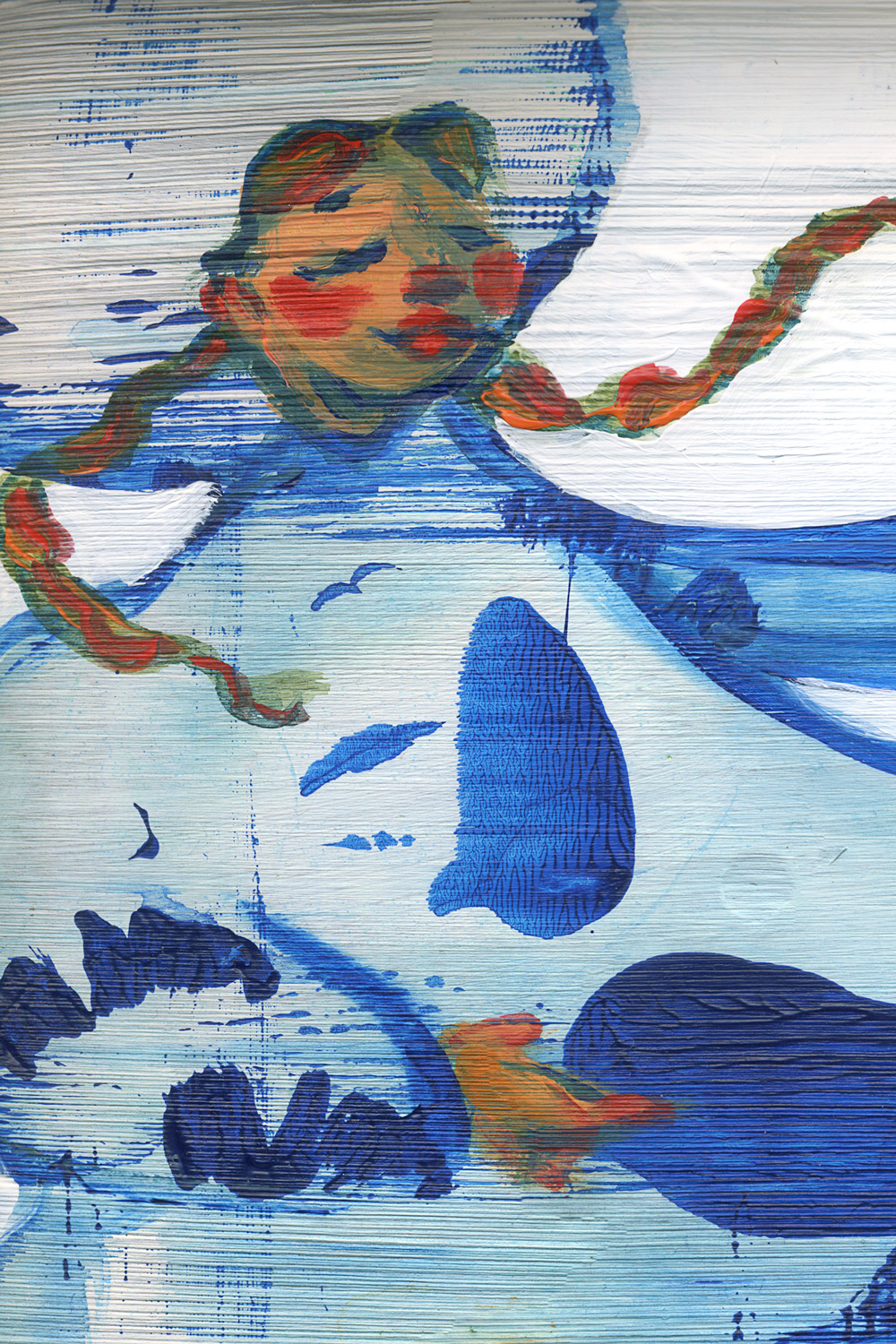 “Muñeca: Merituuli” (25x25 cm) maalauksen hahmon viitta liehuu kuin meren aallot. Hän on matkalla, vaikka seisoo paikallaan. Varpaat kastettuna meriveteen.