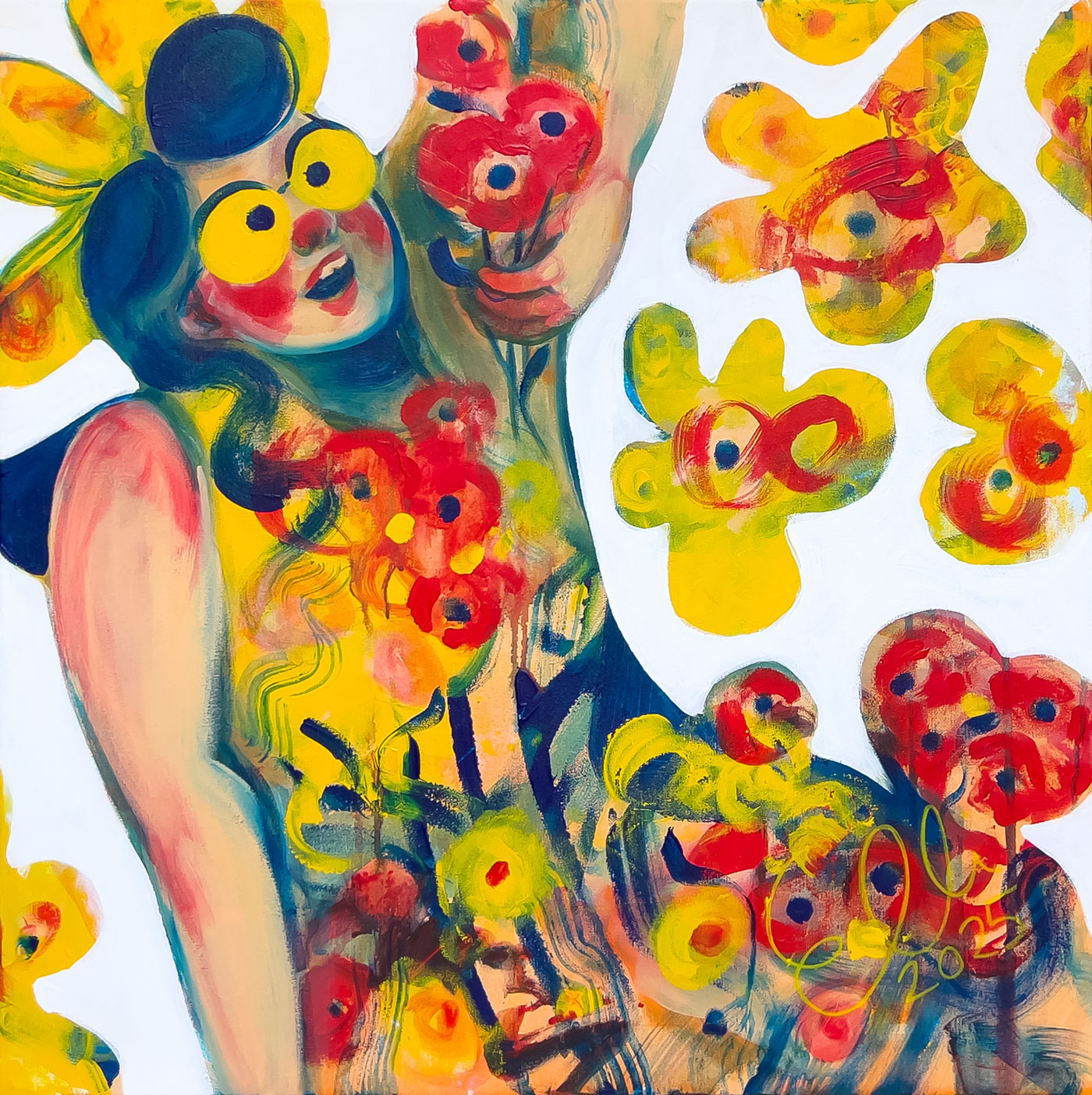"Blooming Eyes" is an original acrylic painting by Finnish contemporary artist Elli Maanpää, depicting a woman delightedly merged with a vibrant floral display.
