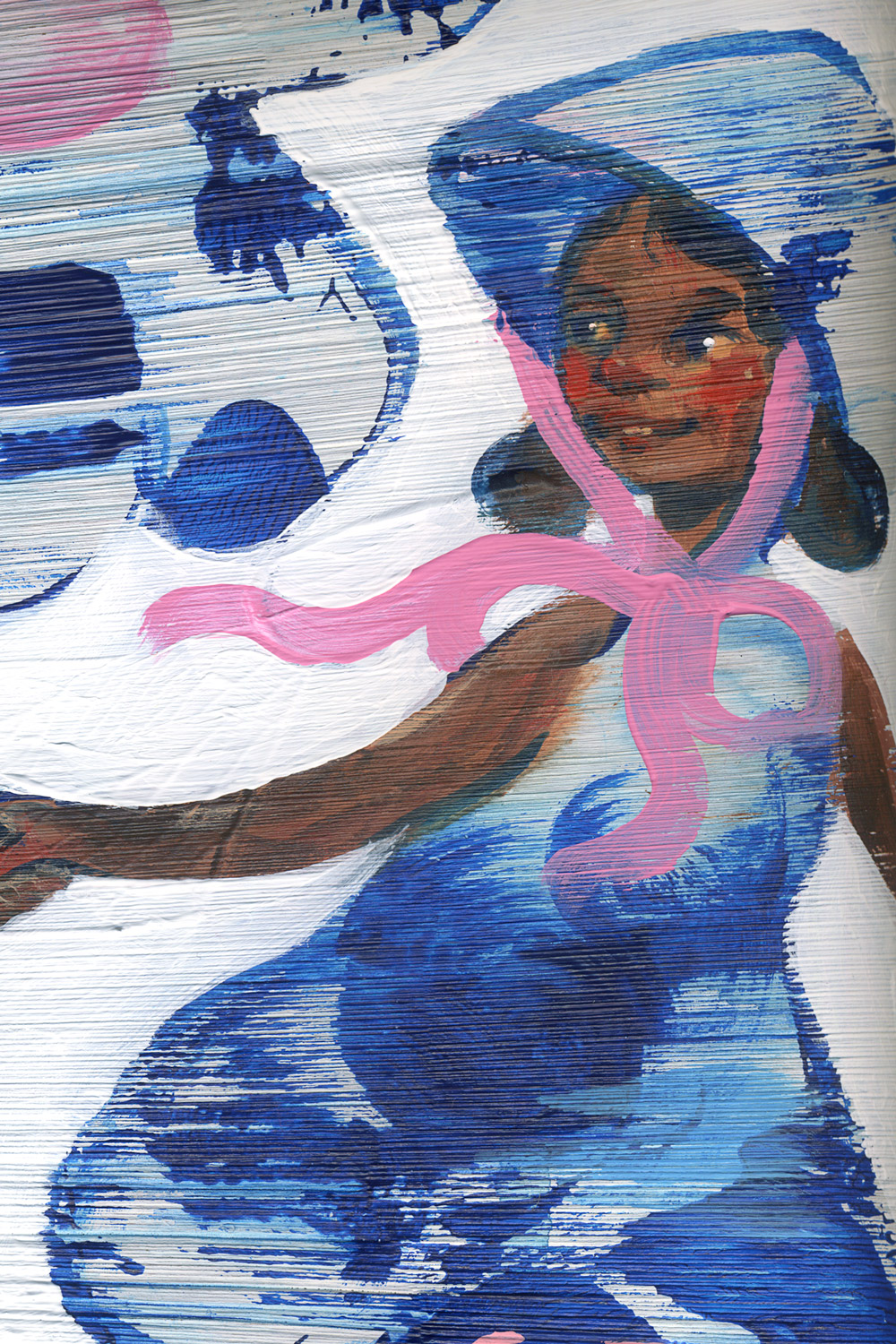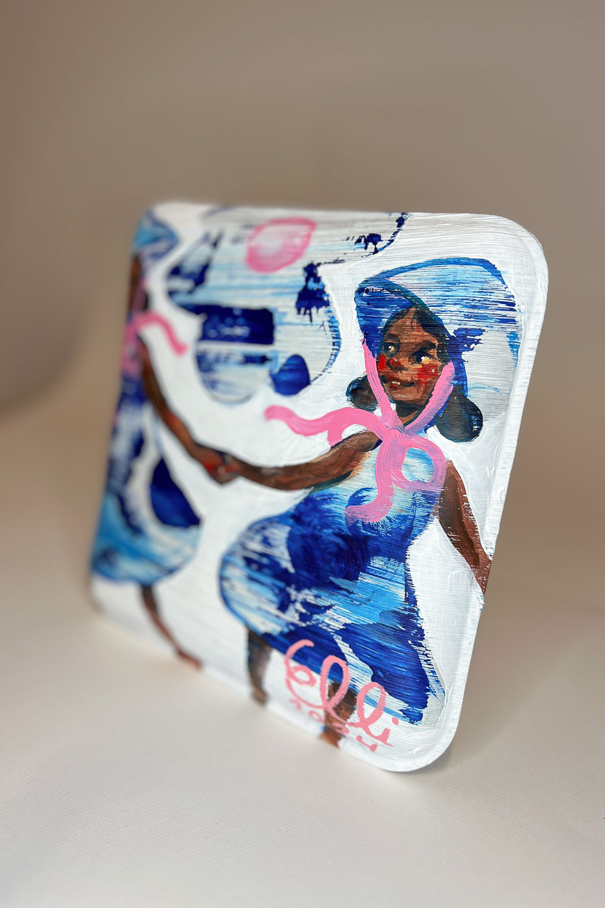 “Muñeca: Yhdessä” (25x25 cm) teoksessa on sinivalkoisiin pukeutuneet kaksoset. Käsi kädessä. Tämä paritanssi jatkuu.